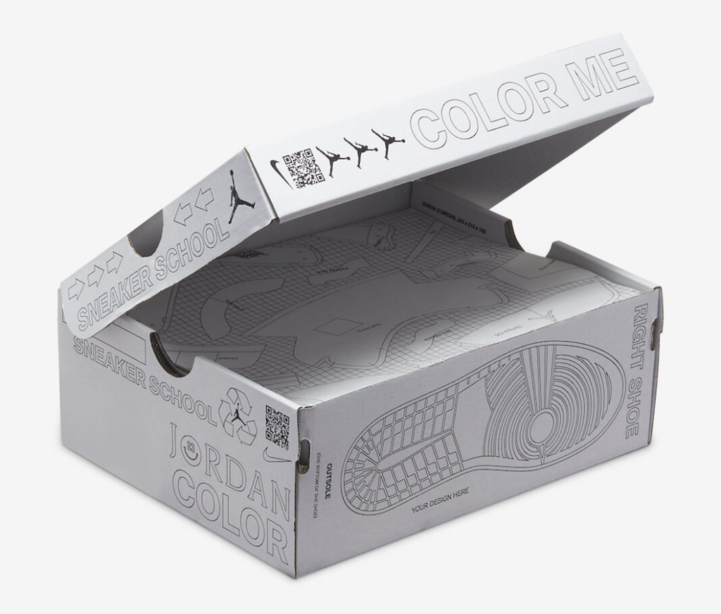 此次的鞋盒也经过特殊设计,黑白线条勾勒出鞋款的三视图,提醒大家可以自行填色,打造独一无二的专属鞋盒。