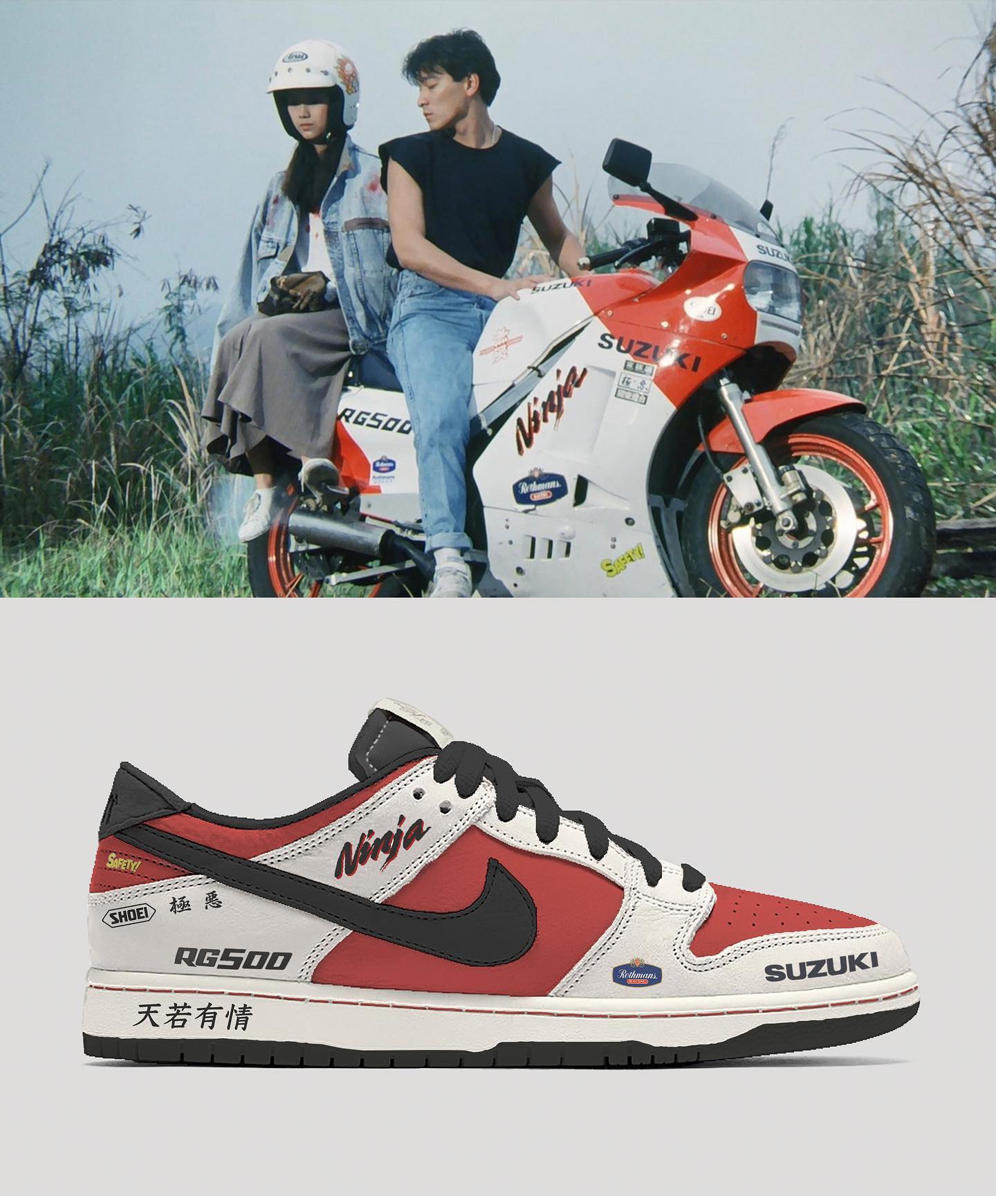 以片中刘德华的座驾铃木 RS500 为灵感打造,还原了这款摩托的涂装及贴纸细节。