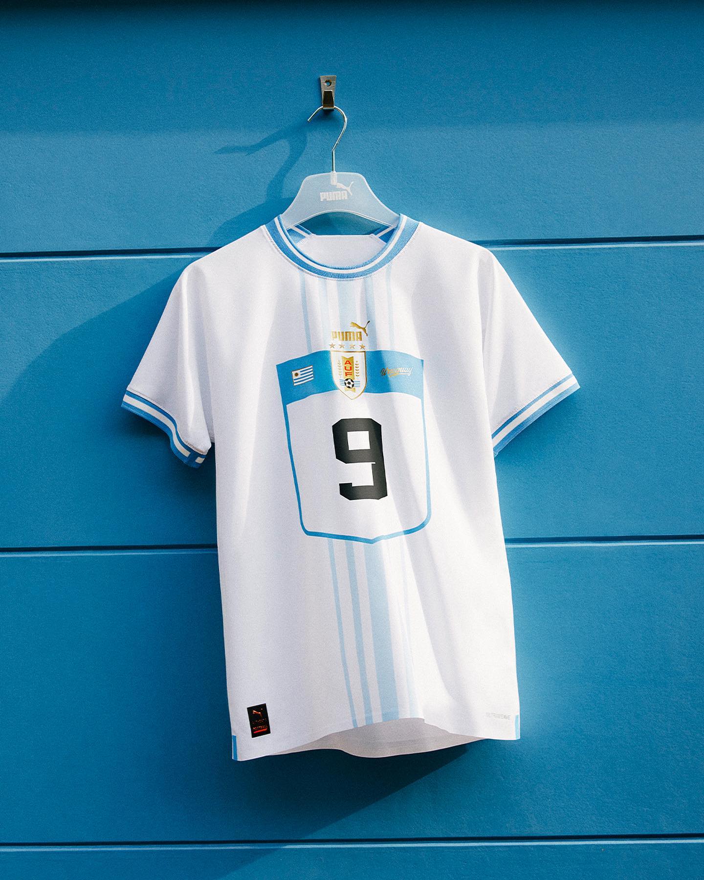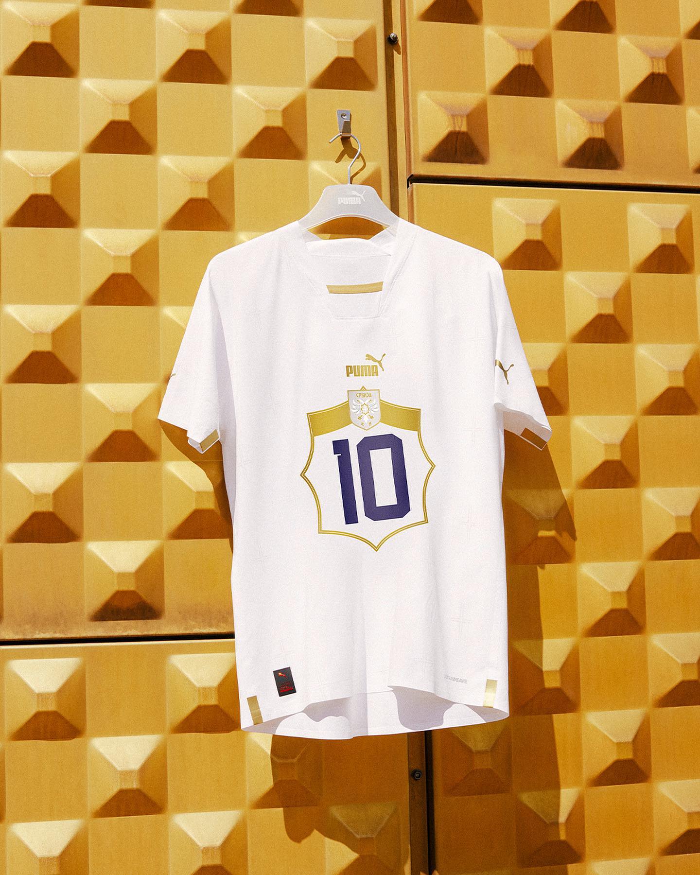 再来看看 PUMA,相比 adidas 的设计简约不少,采用纯色主体,在胸前正中印有球队 Logo、号码以及专属几何图案。