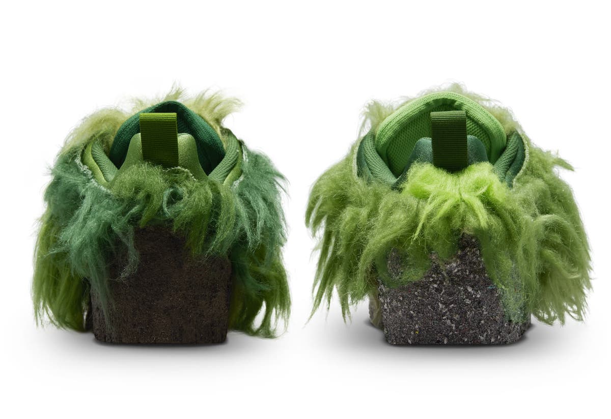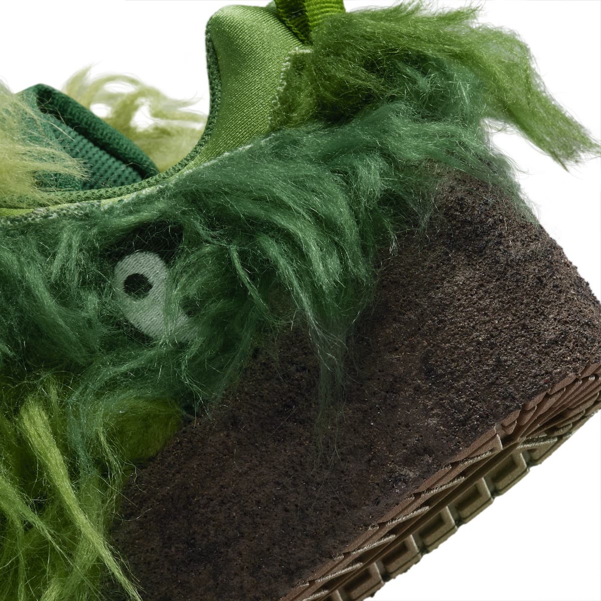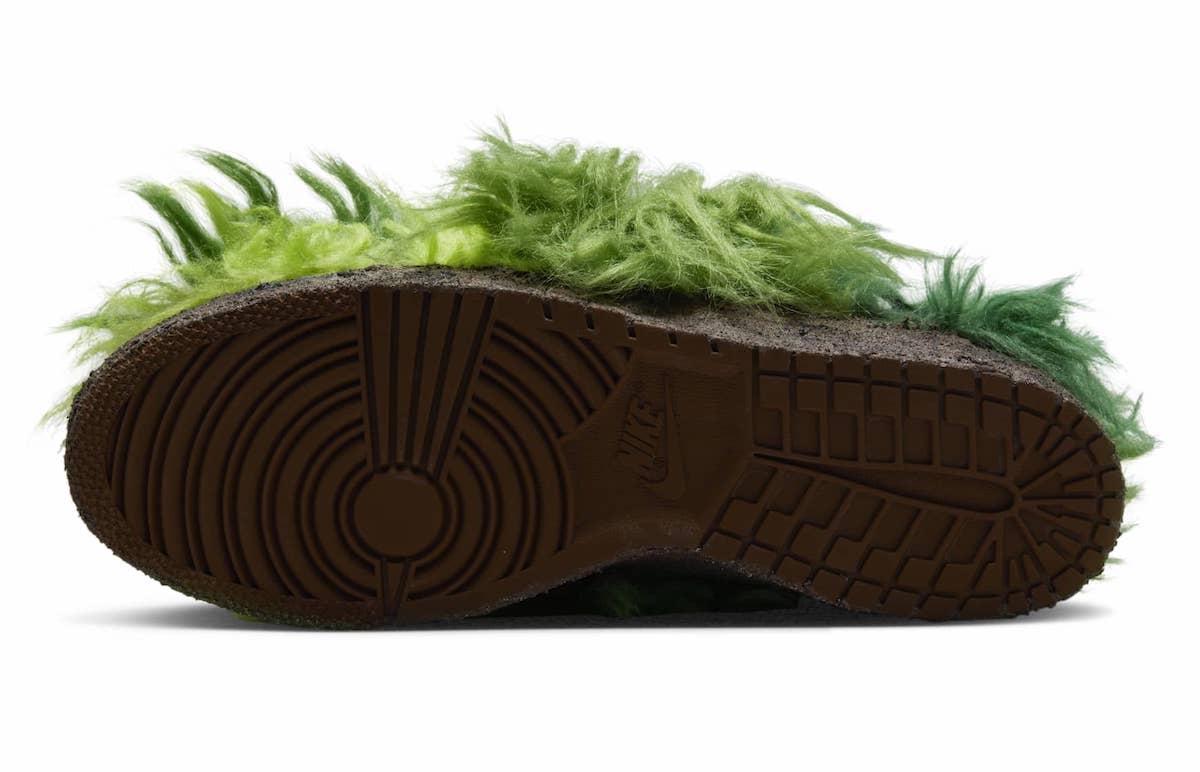 鞋面覆盖深浅不一的长毛材质,灵感来源于儿童动画角色绿毛怪格林奇,不细看真不容易看出是一双 Dunk 鞋型。