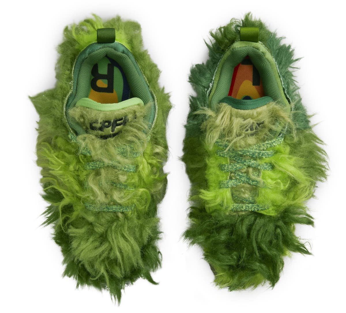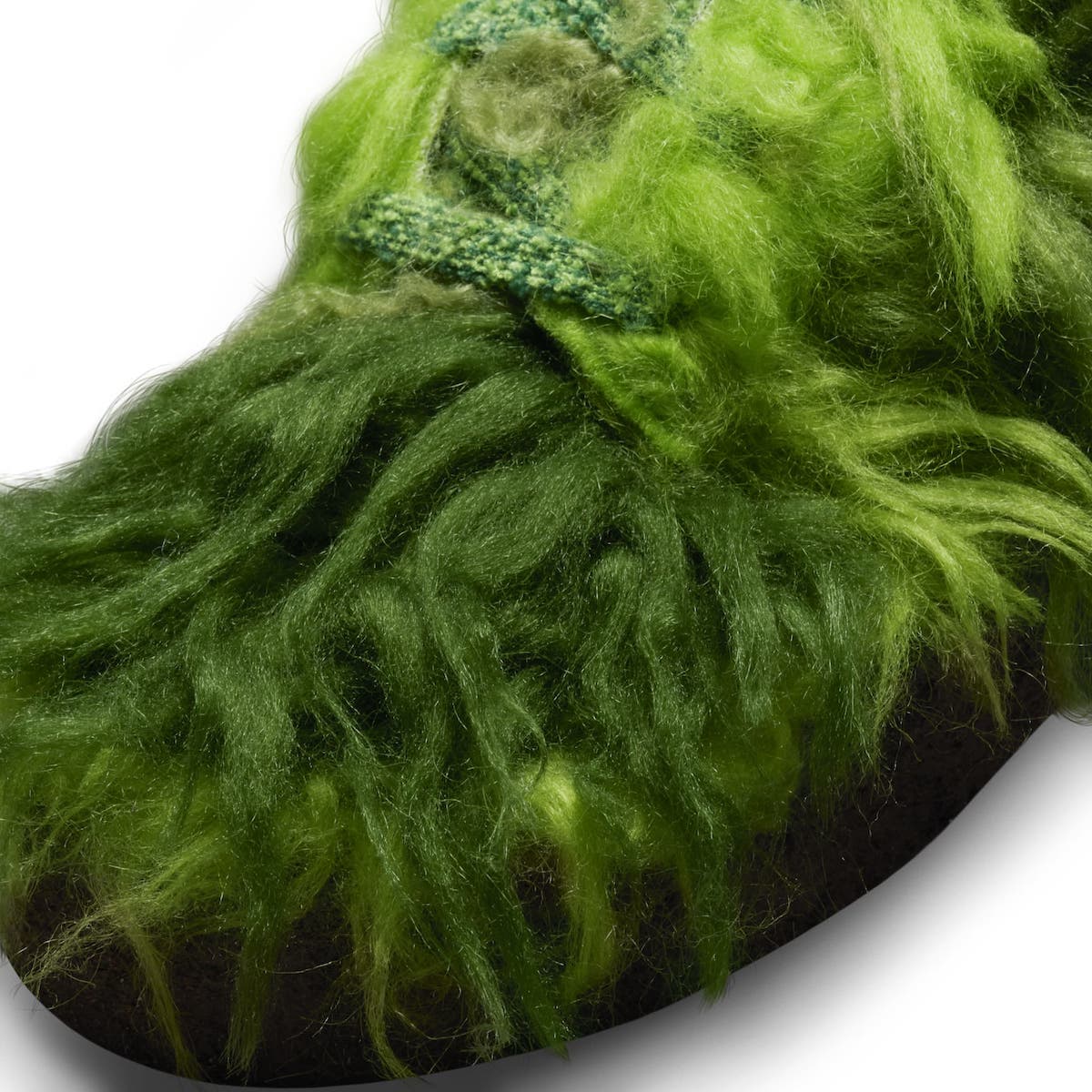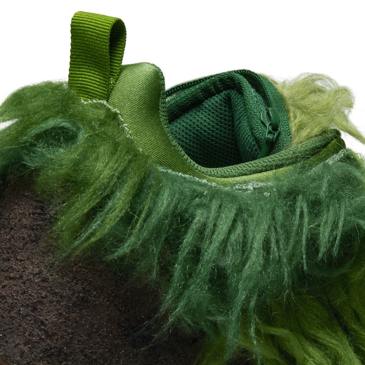鞋面覆盖深浅不一的长毛材质,灵感来源于儿童动画角色绿毛怪格林奇,不细看真不容易看出是一双 Dunk 鞋型。