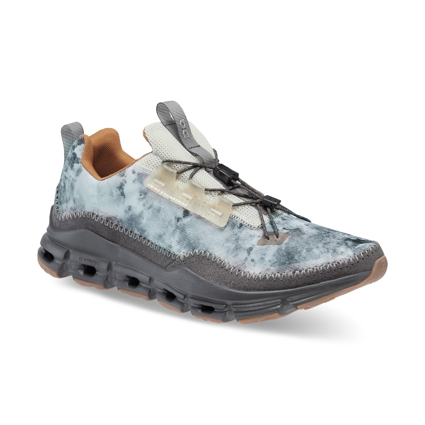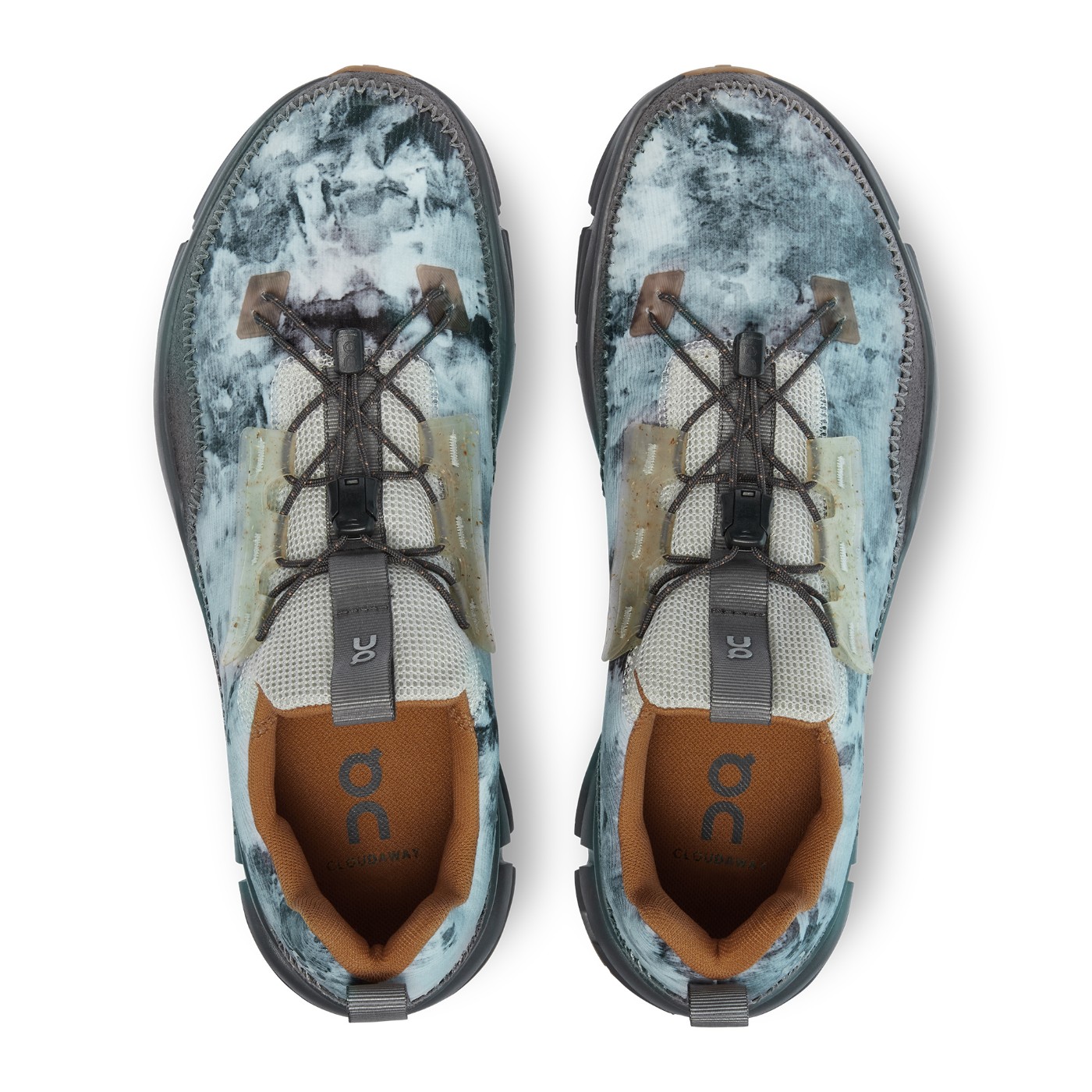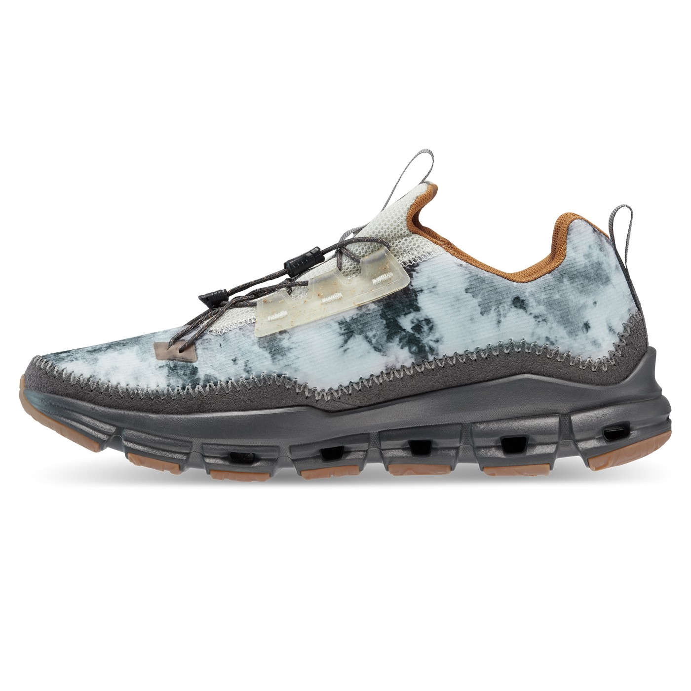 鞋面独特的冰染印花,搭配半透明鞋眼饰片和橡胶压胶细节。