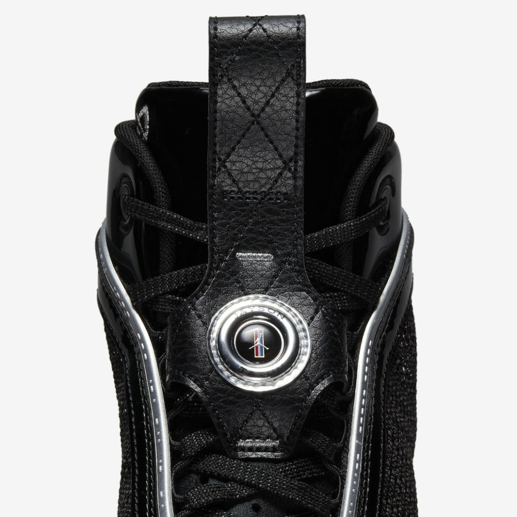 除了鞋面的网纱材质外,其余的地方则以黑色漆皮覆盖,营造福特野马上光泽漆面的形象。