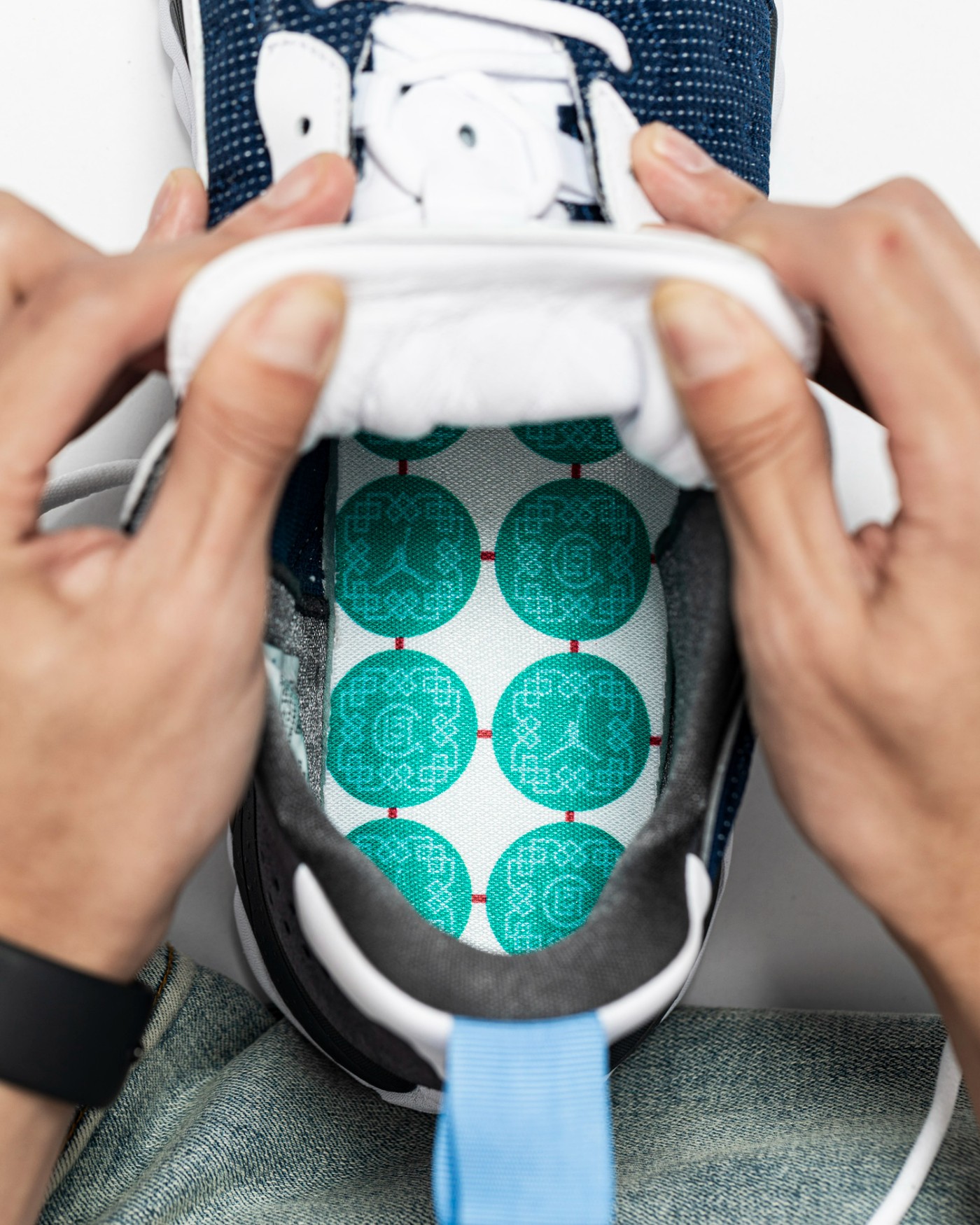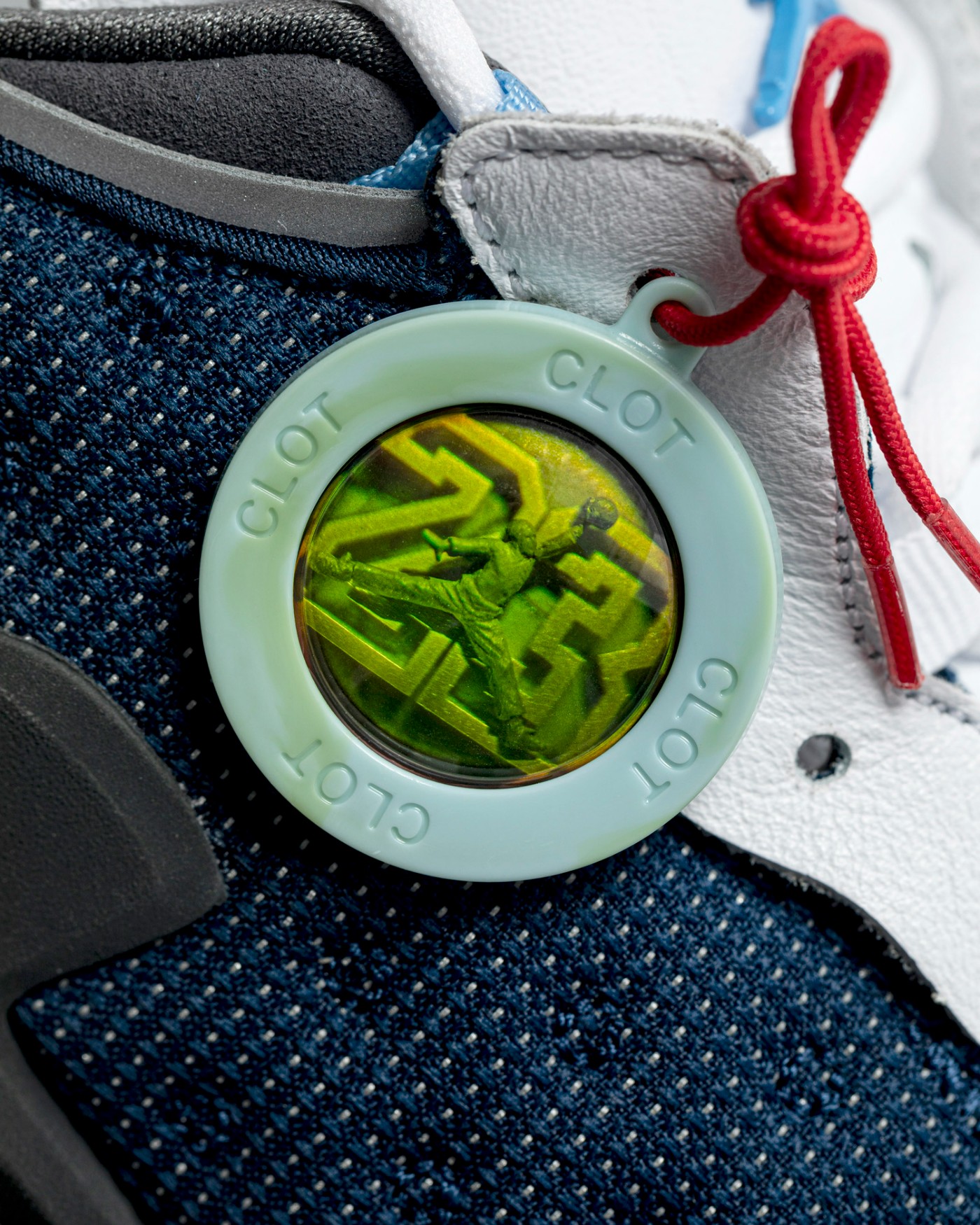 同样突出联名身份的,还有鞋舌上的 Logo,一左一右分别是 Jumpman Logo 和 CLOT 标志。