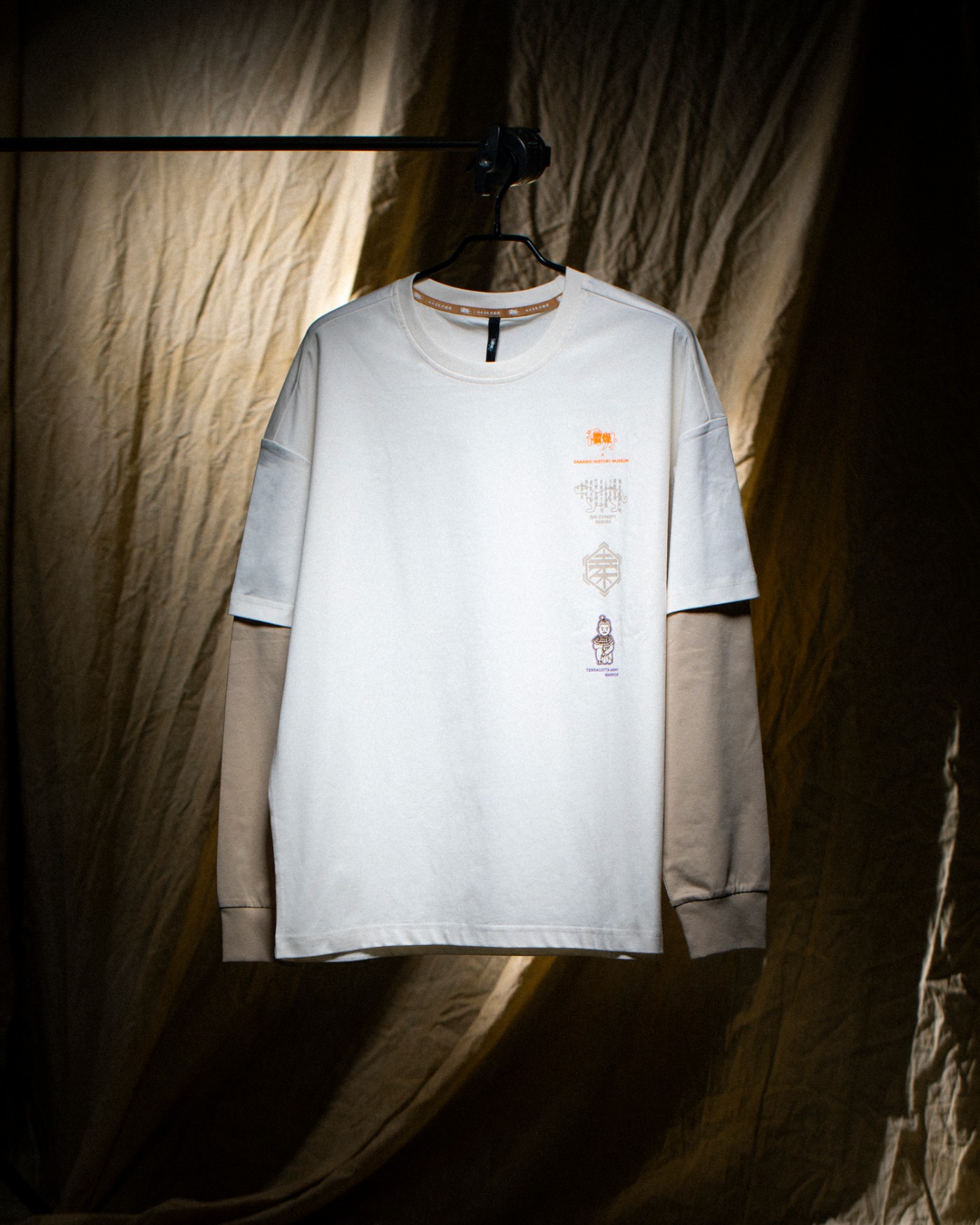 礼盒中的 T 恤采用假两件设计,白 + 卡其色呼应此次联名的整体色调。