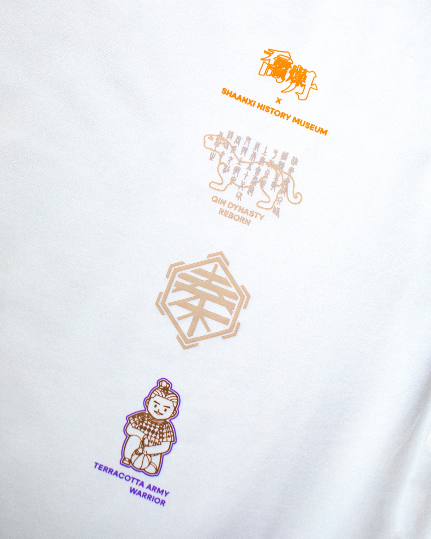 胸前设计颇具看点,不仅有双方 Logo 彰显联名身份,还加入了虎符及小篆文字、秦字 Logo,以及兵马俑标志性的跪俑形象,充分展现秦朝文化。