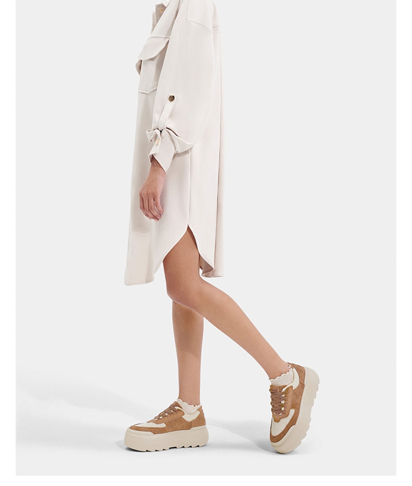 这是 UGG 秋冬最新鞋款,鞋面采用经典的板鞋造型,鞋底则是超厚设计,带来夸张增高效果。