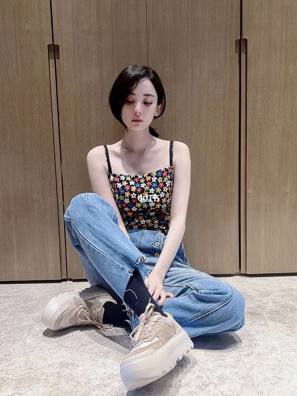 娜扎最近又有新造型,碎花吊带配牛仔裤相当清爽,但她脚上的新鞋恐怕没人认识。