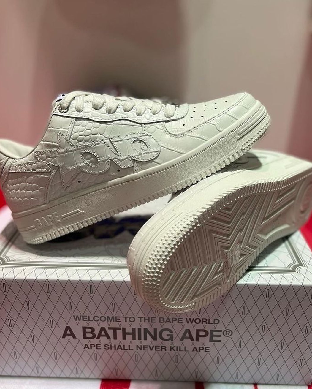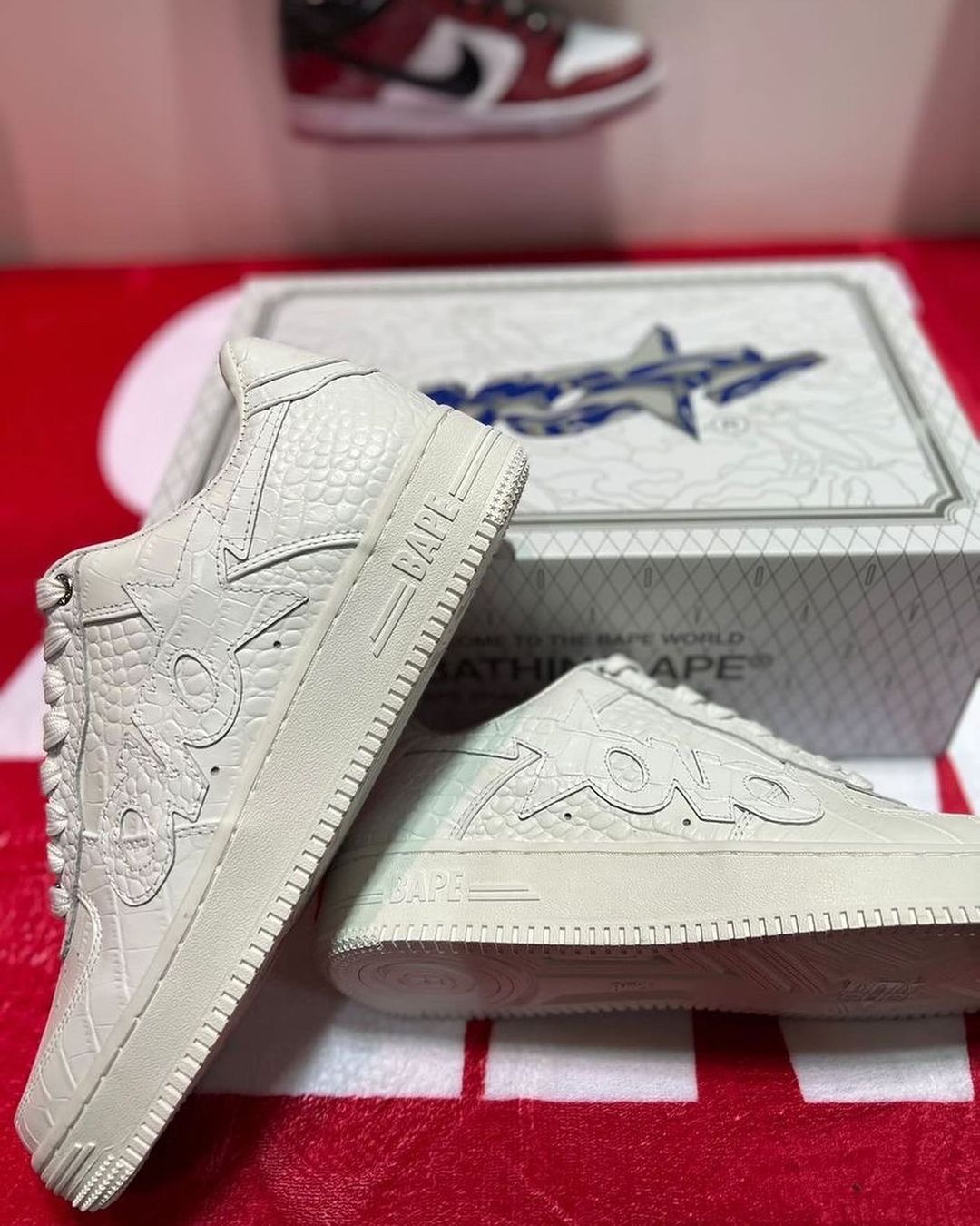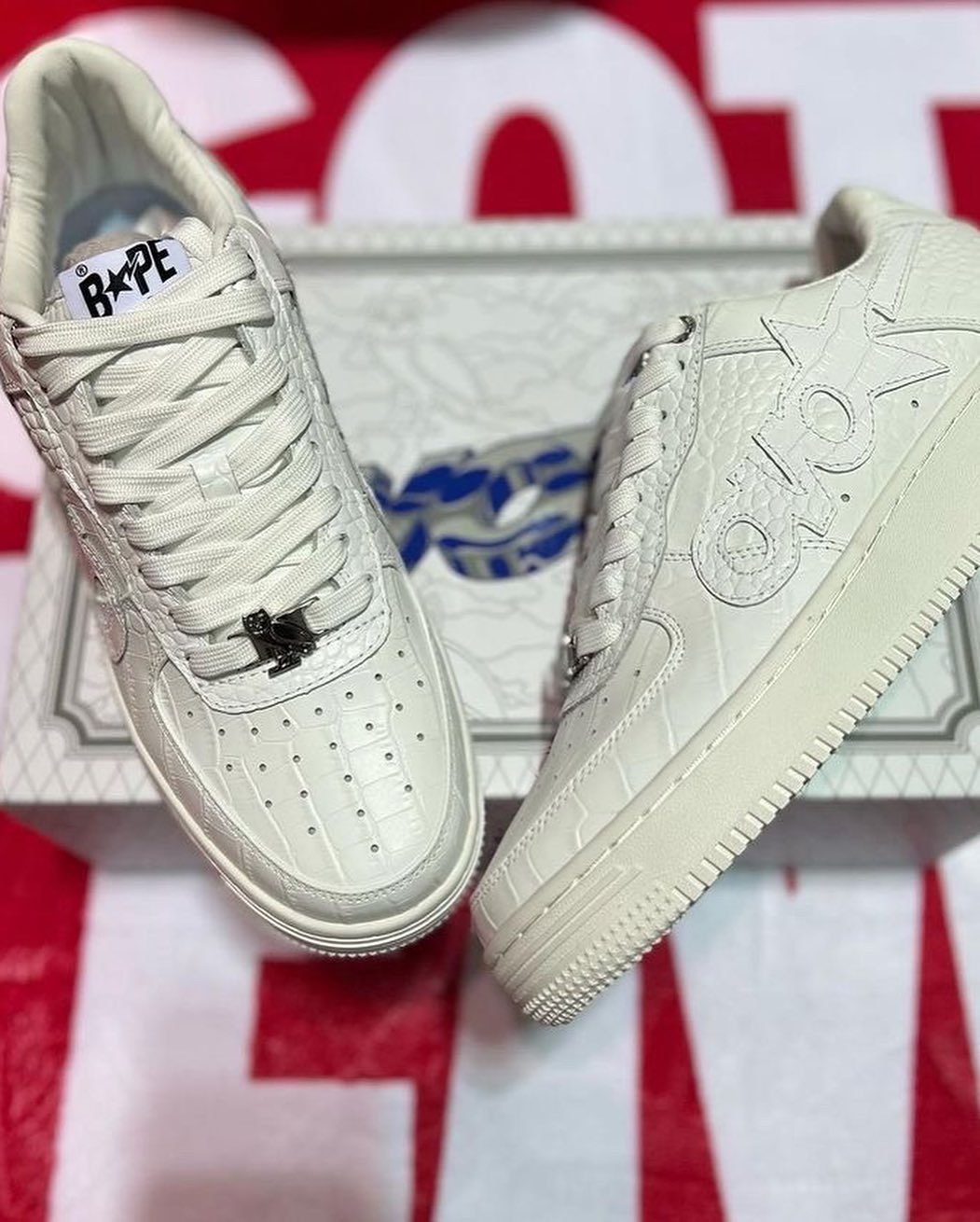 双方选择了备受大家喜爱的 BAPE STA 鞋型,整双鞋以纯白配色方案,拥有不错的搭配属性。