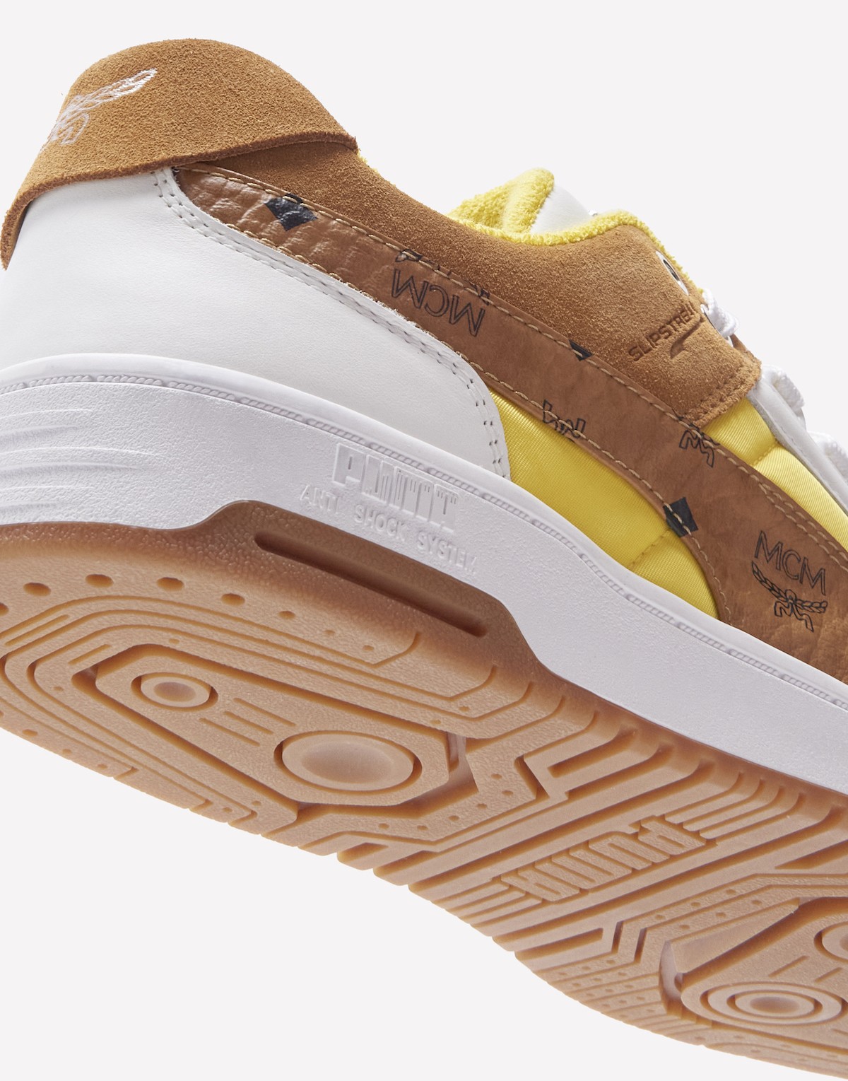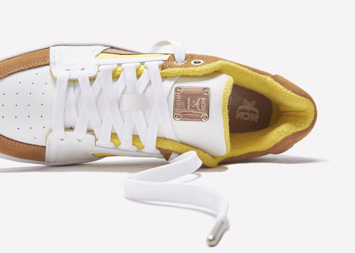 首先来看率先曝光的第一款 Slipstream Lo,整体采用白色、黄色以及 MCM 标志性的卡其棕色打造鞋身。