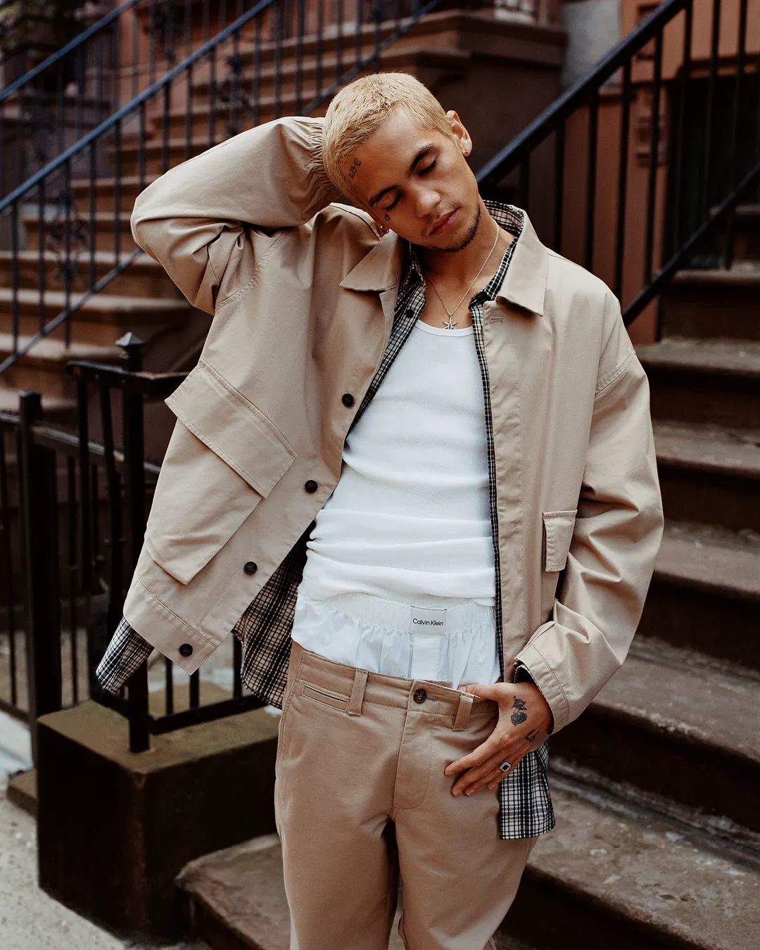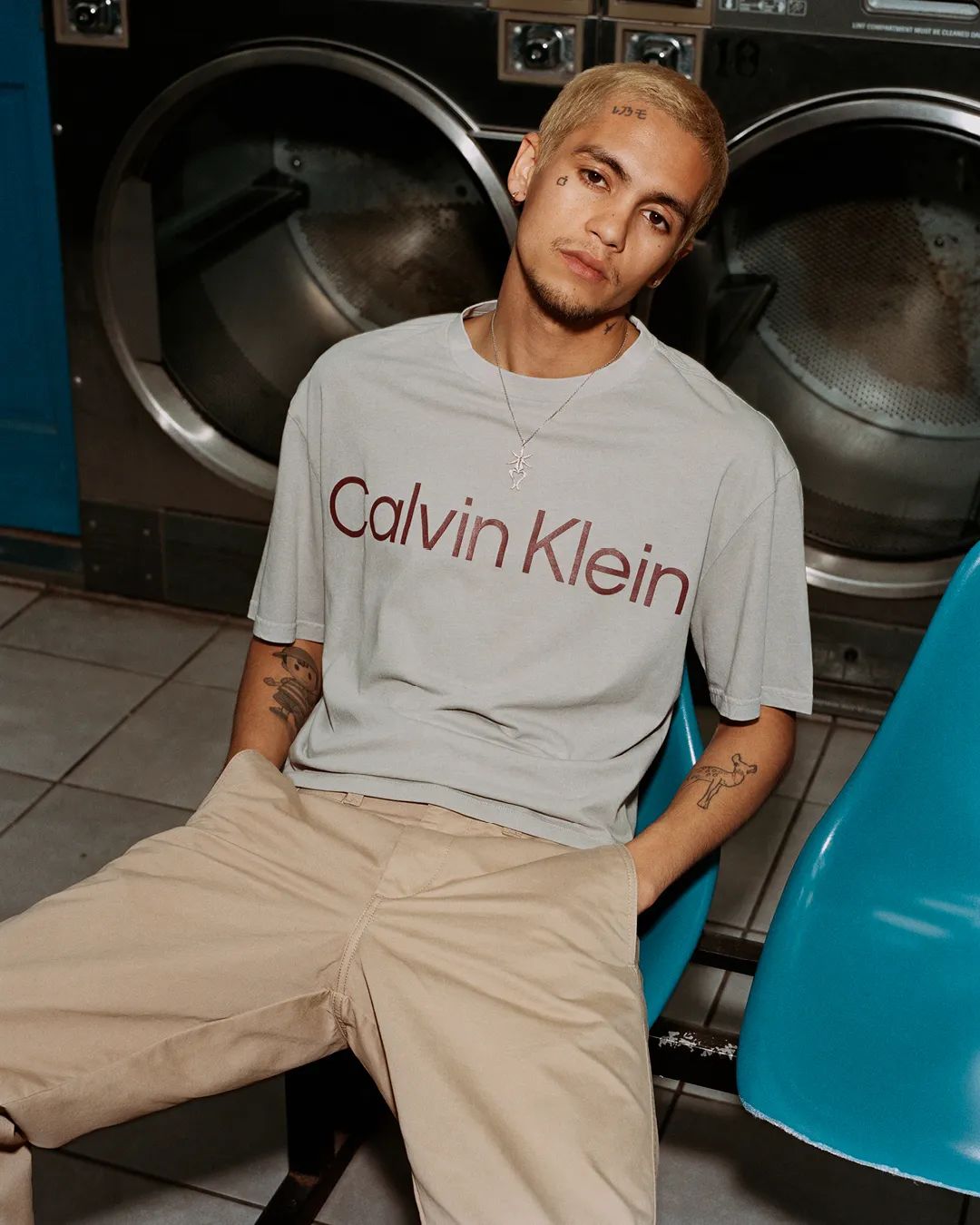 上身带有经典 Calvin Klein LOGO 的短袖 T 恤,下身简单一条卡其长裤,就有很强的街头感。