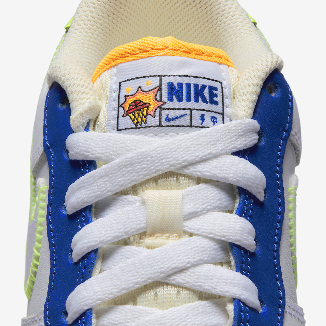 整双鞋采用白色,橙色,荧光绿色,蓝色进行搭配,营造出极强的视觉效果。