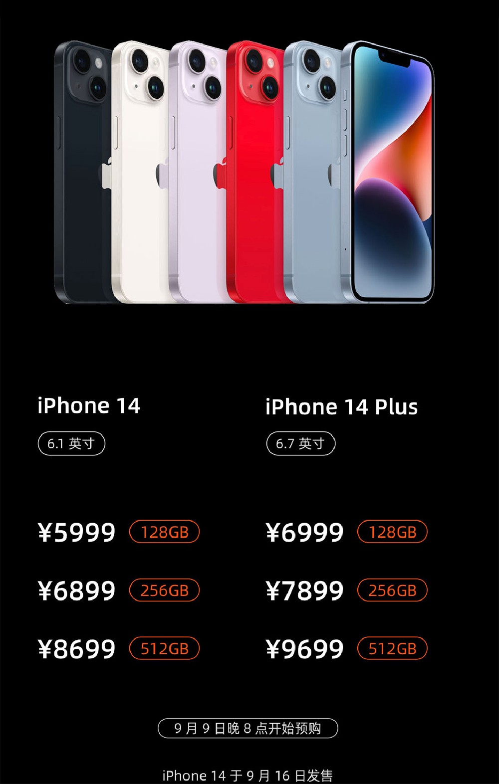 iPhone 14 与 iPhone 14 Plus 共同出午夜色、星光色、紫色、红色和蓝色,共计 5 款配色。