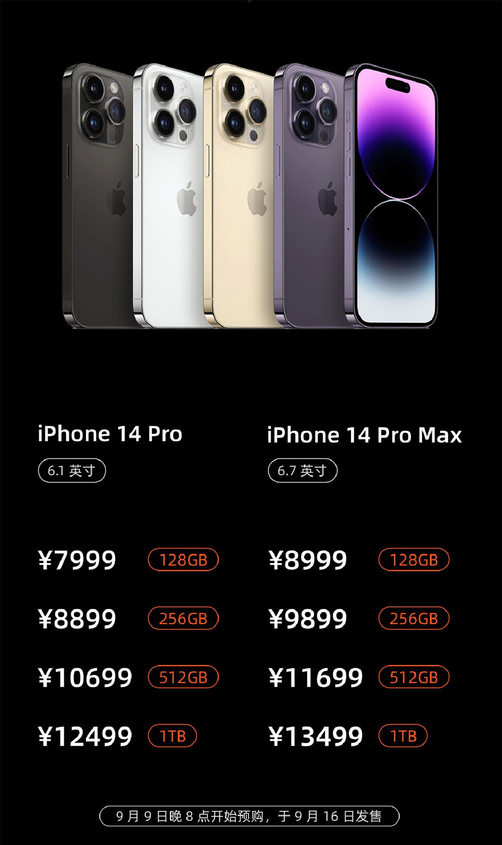 配色方面, iPhone 14 Pro 和 iPhone 14 Pro Max 一致,共推出深空黑色、暗银色、金色、紫色(新),共计 4 款配色。