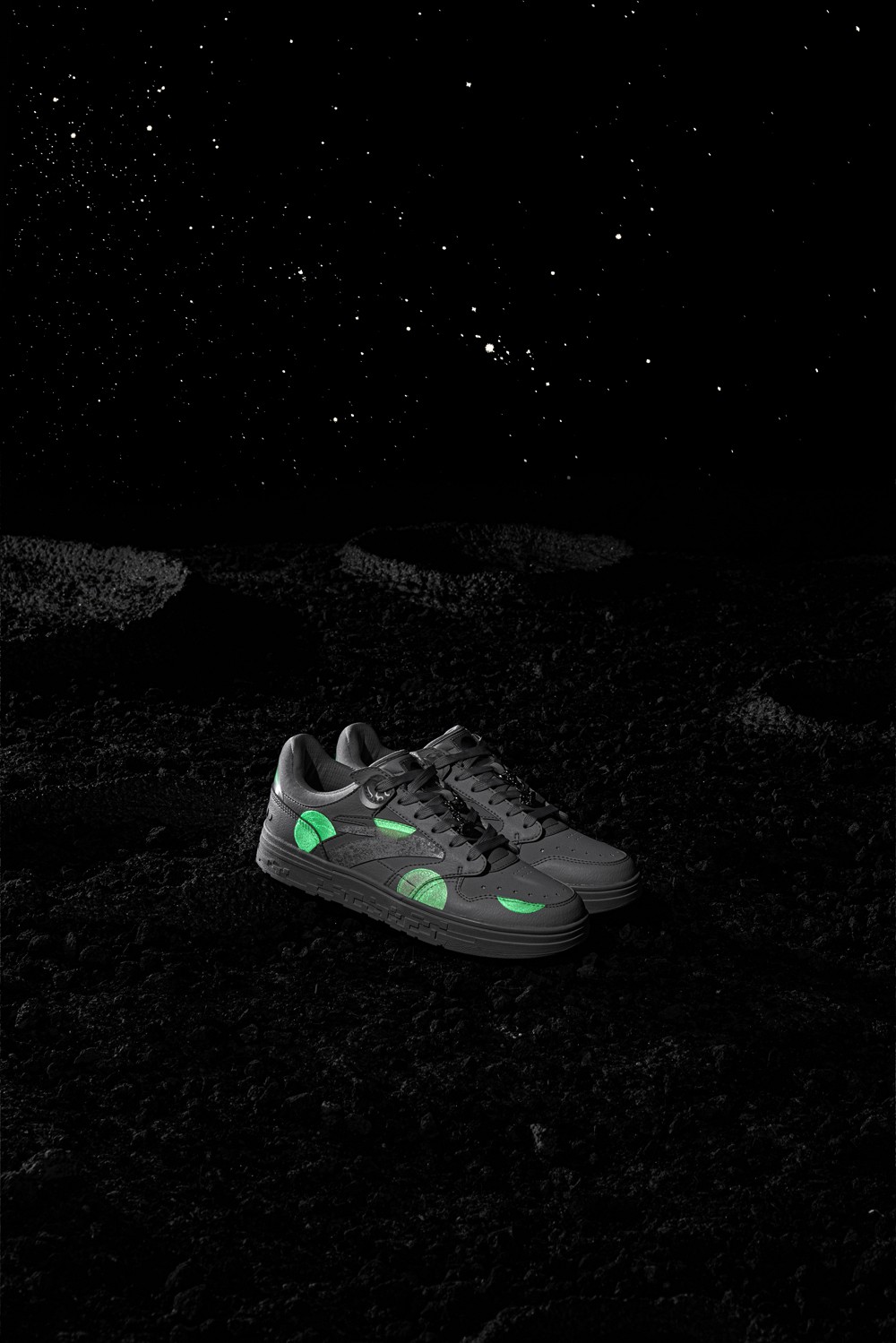 鞋身还暗藏还原月球的夜光印记,并在鞋舌处加入可拆卸「骰子」挂坠,寓意投掷骰子赢好礼,盼好彩头的民间习俗。