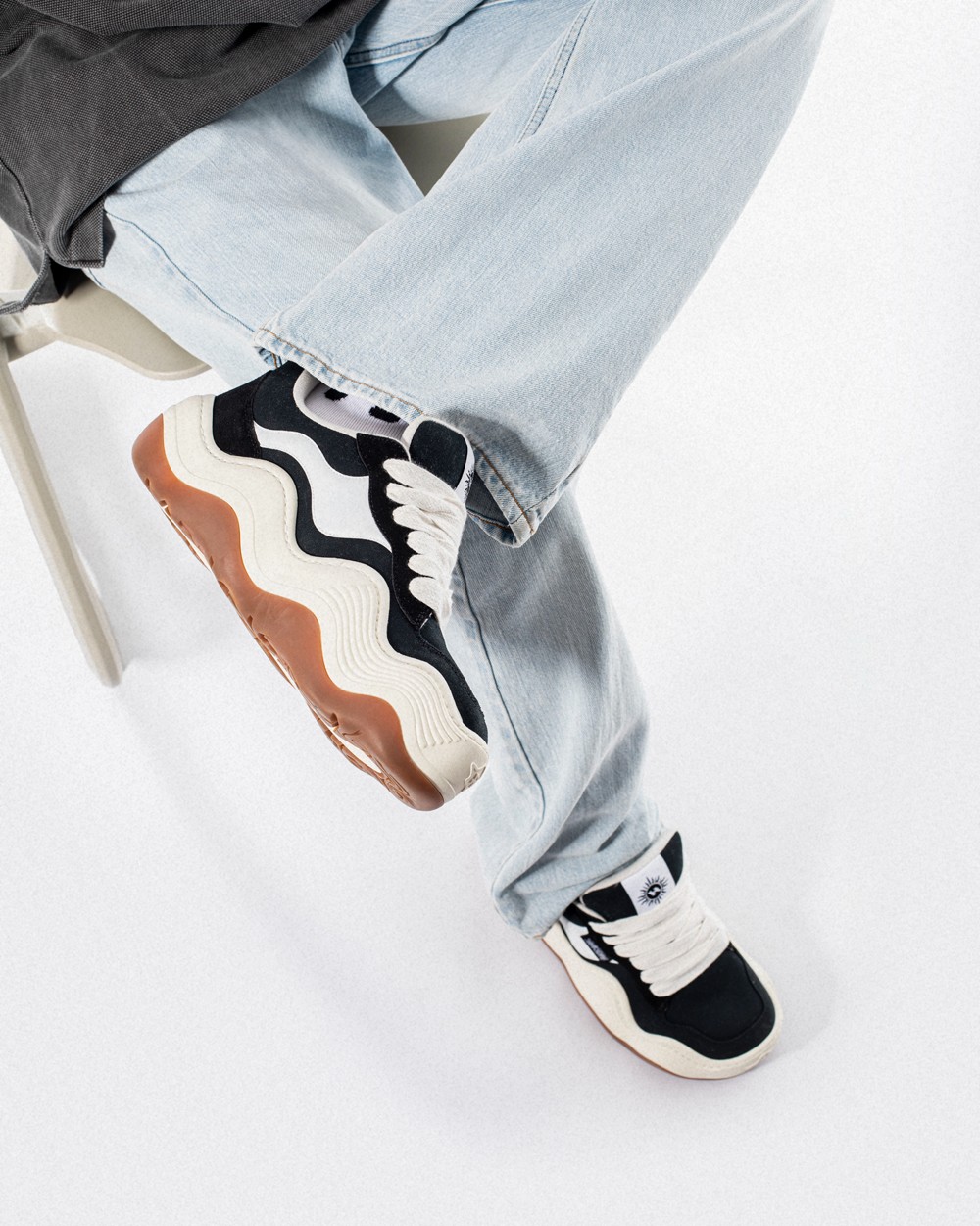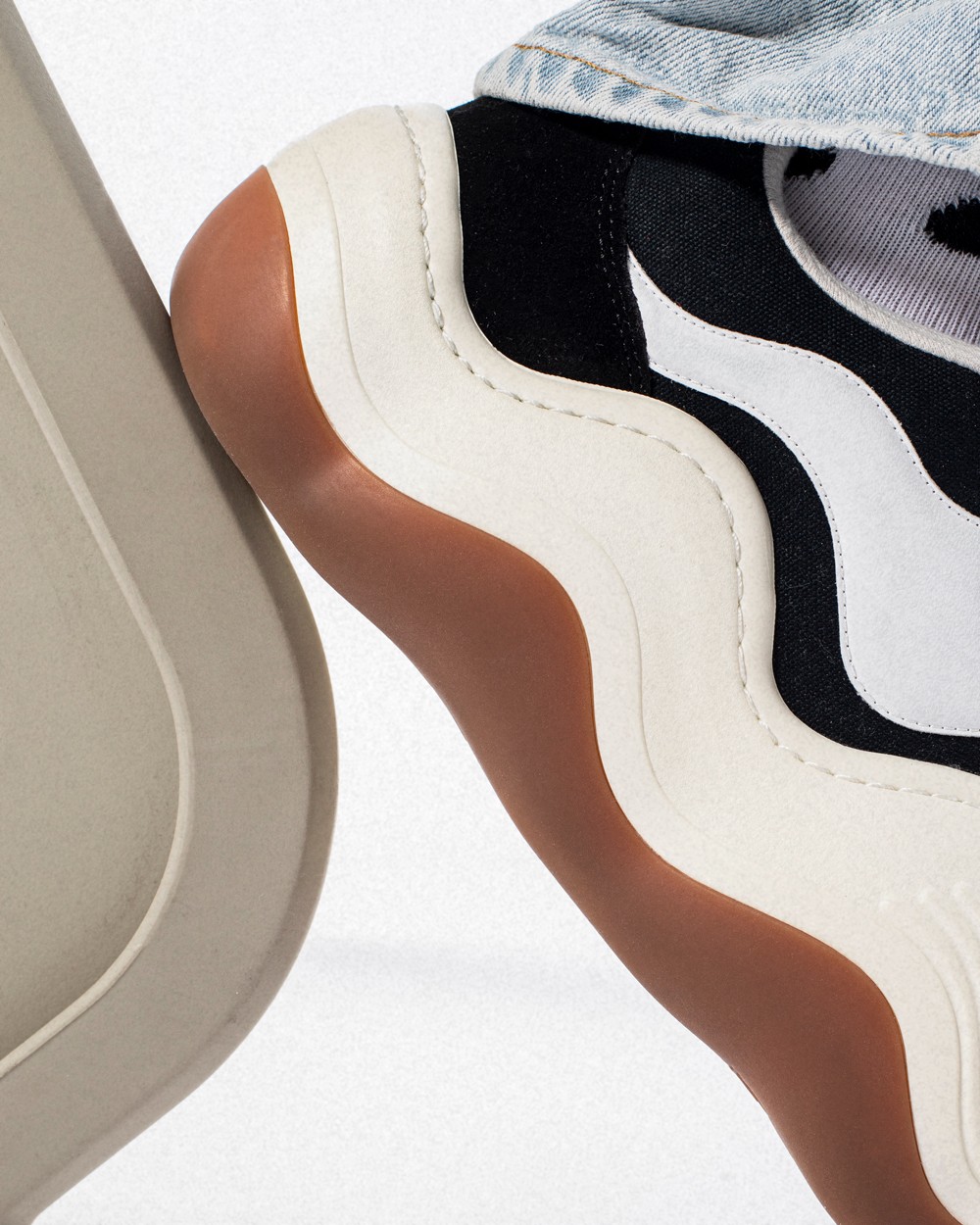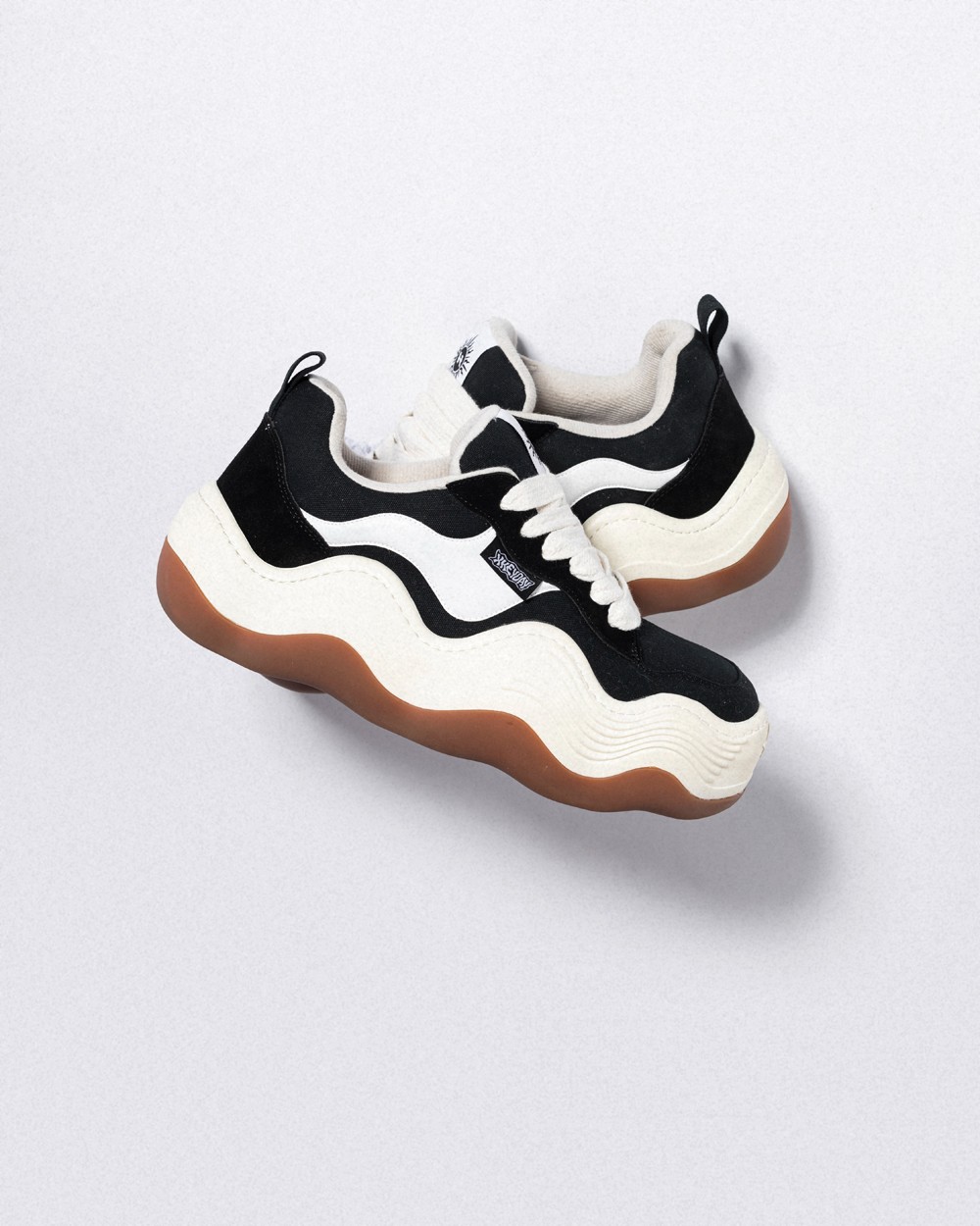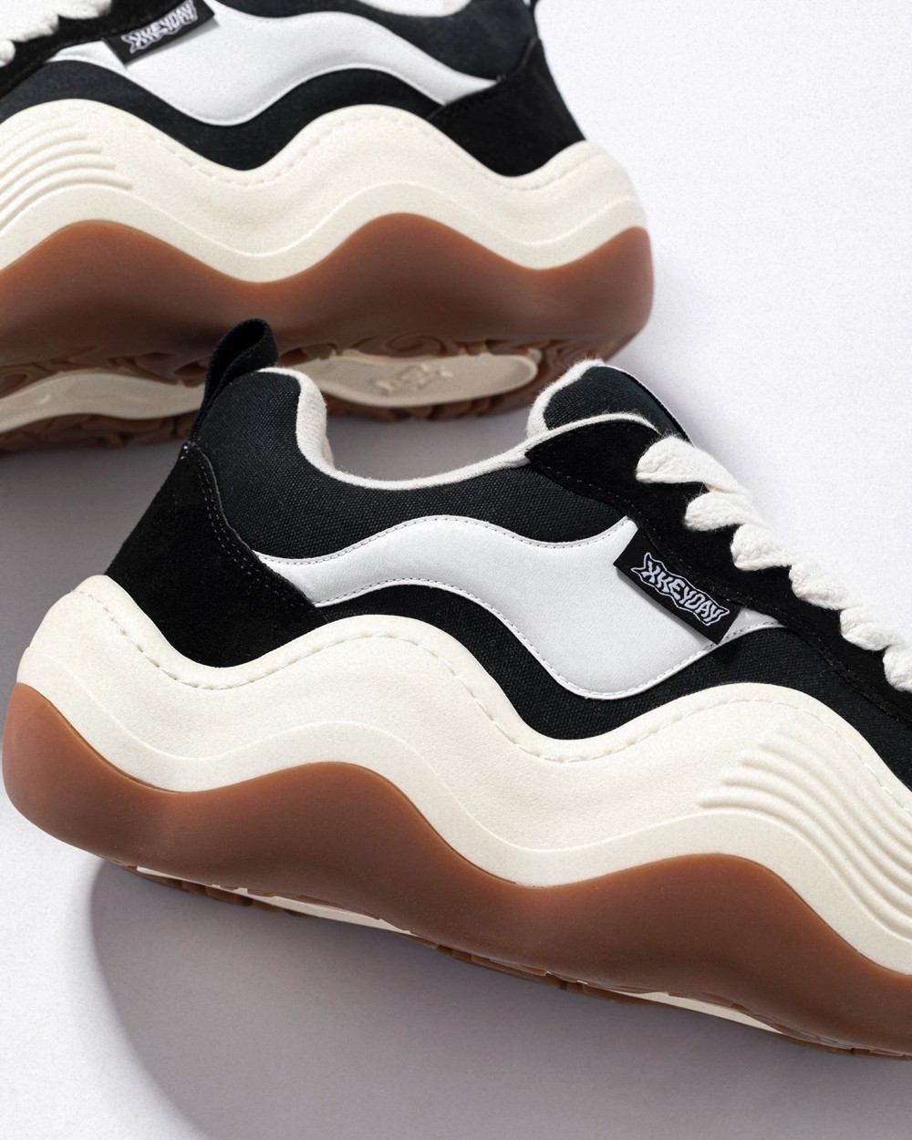 另一个有意思的设计就是仿佛被溶解一般的中底,就连鞋侧 Logo 和标签也都进行了扭曲的处理,搭配中底前部的波浪形纹理,丰富了视觉层次。