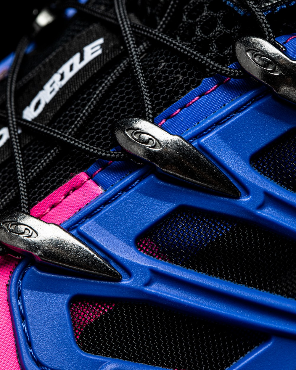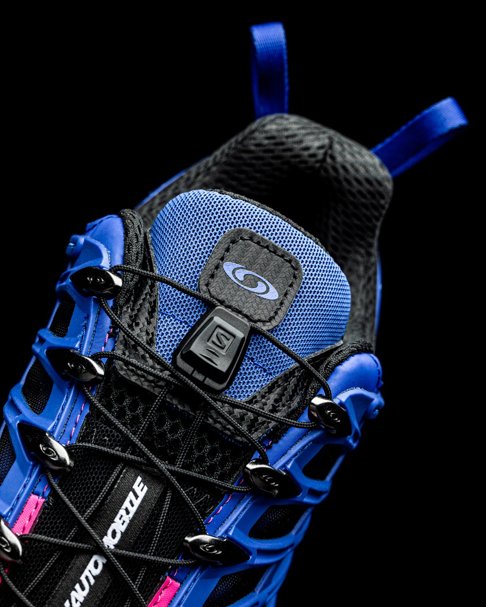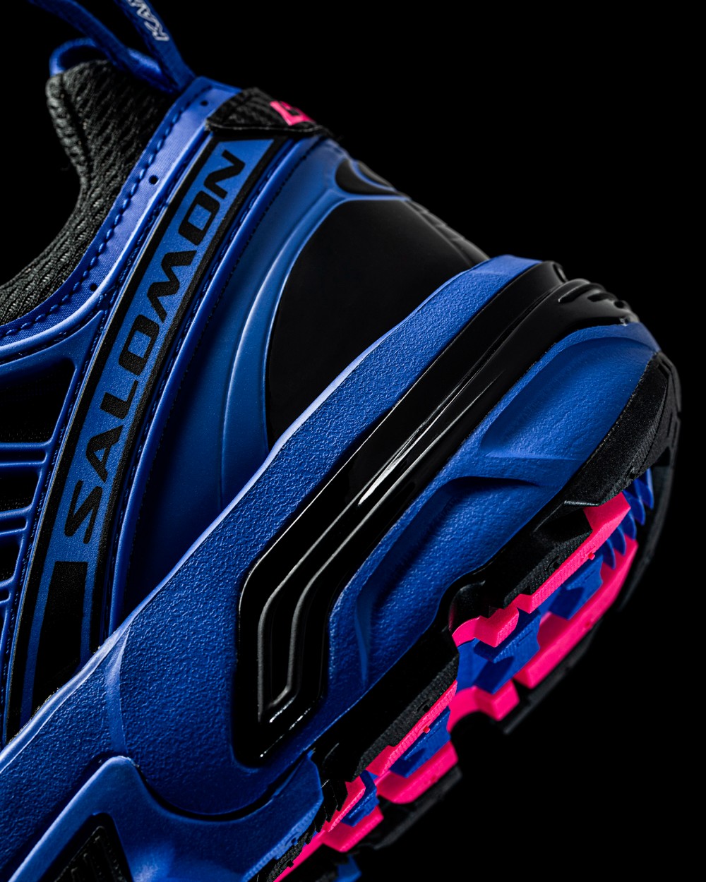 外底采用 Salomon 当家的 Agile Chassis System(ACS 底盘)科技,并同样以红蓝撞色装扮,呼应鞋身配色。