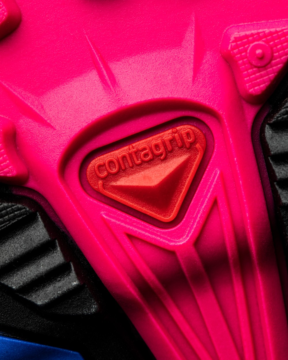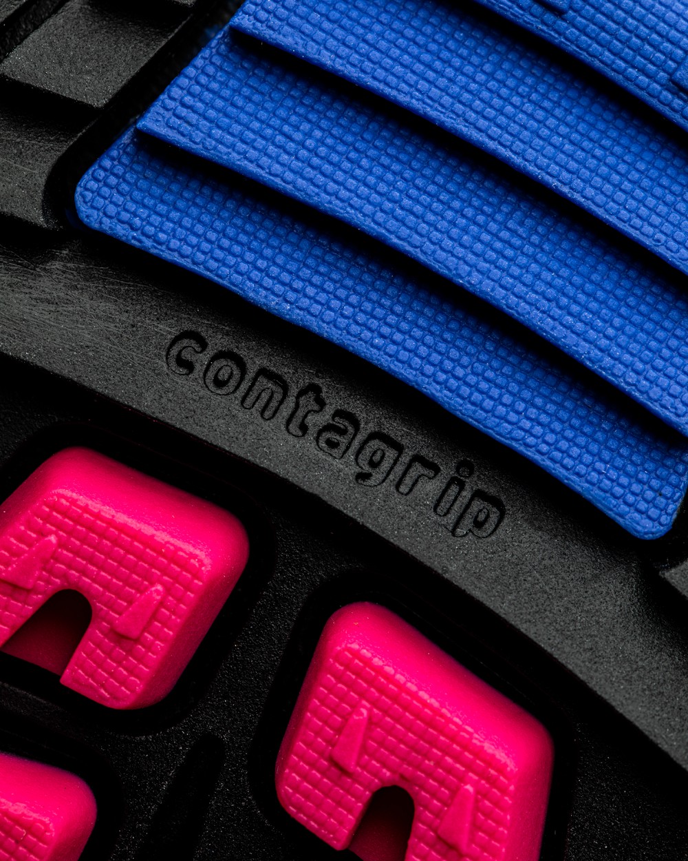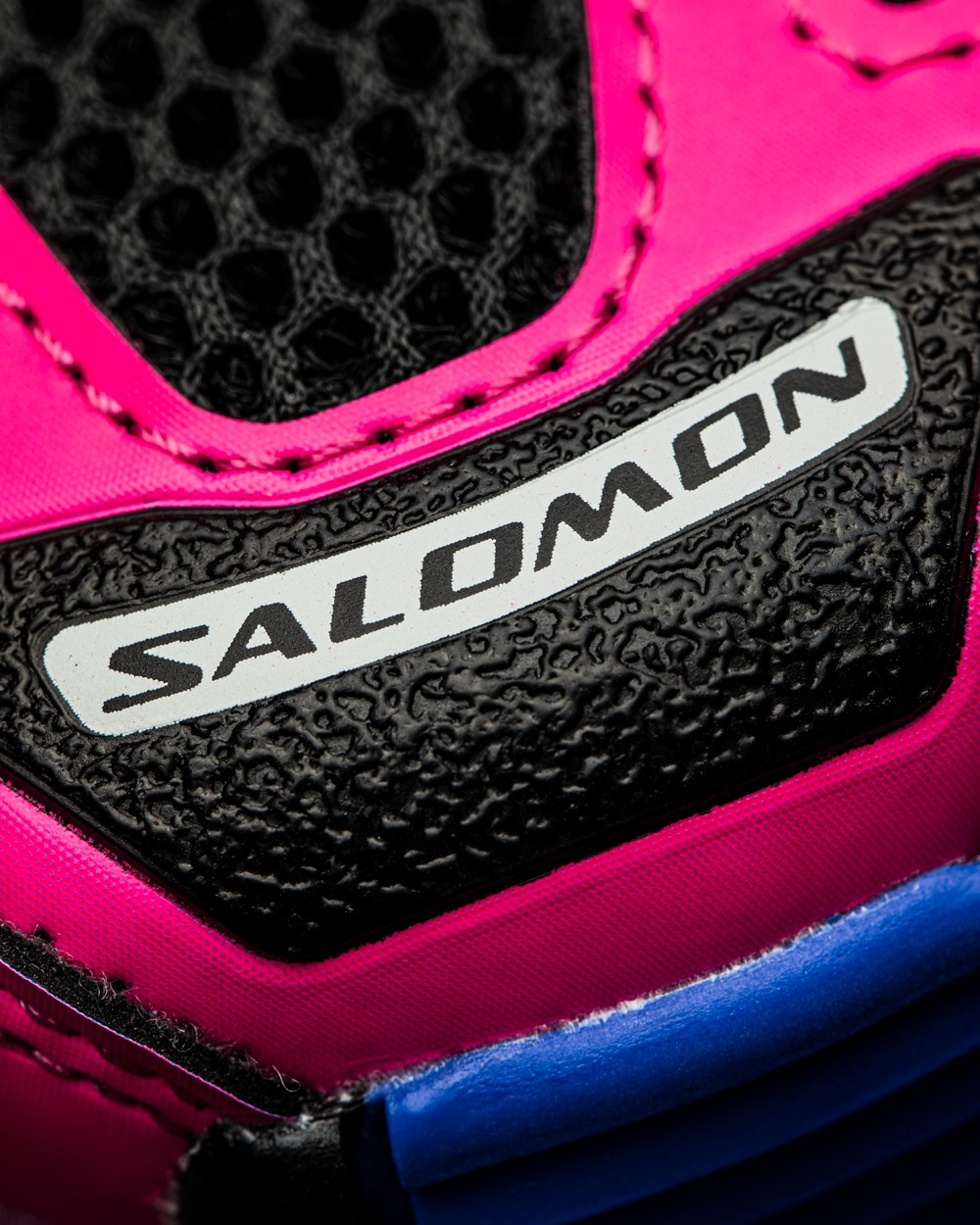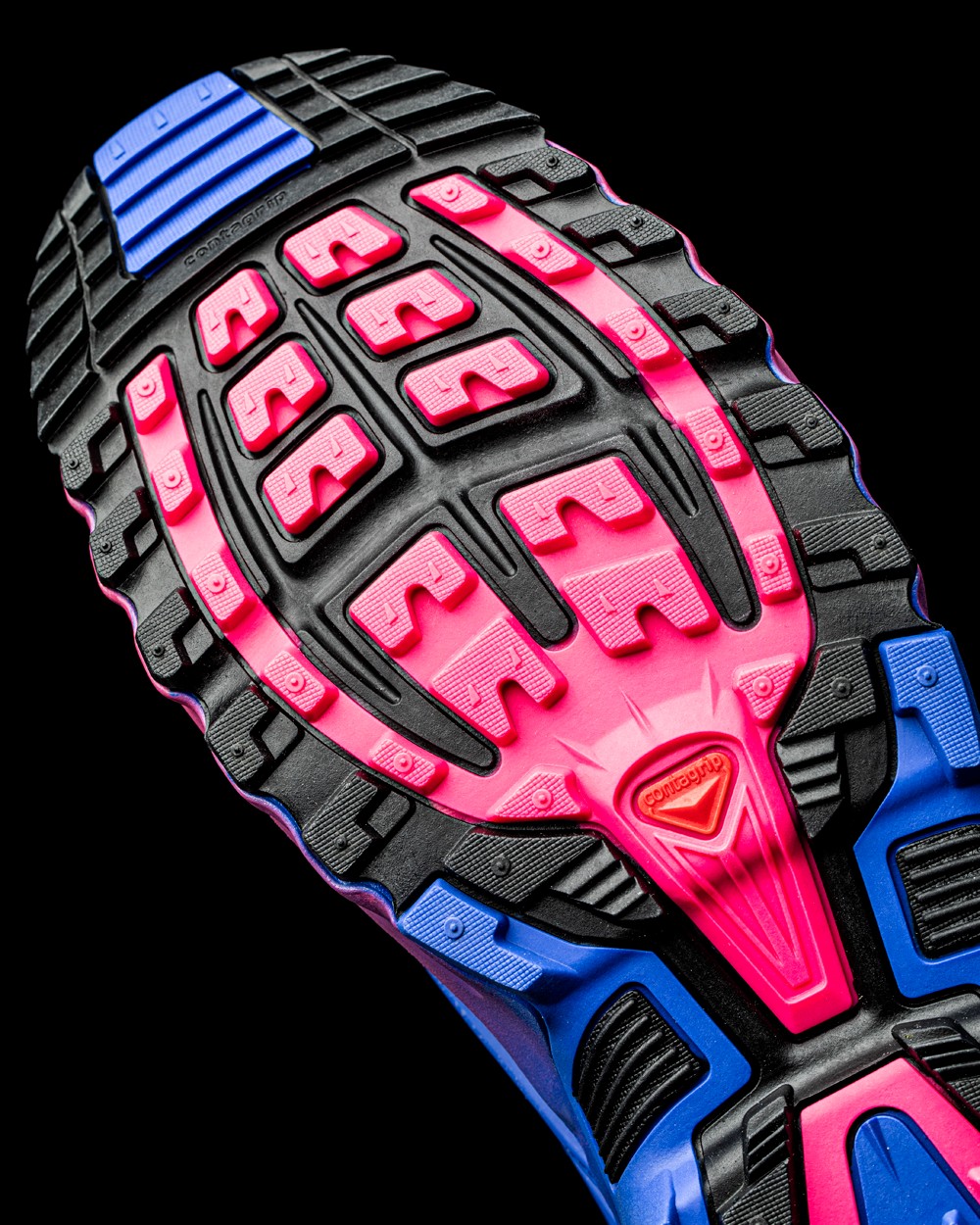 外底采用 Salomon 当家的 Agile Chassis System(ACS 底盘)科技,并同样以红蓝撞色装扮,呼应鞋身配色。