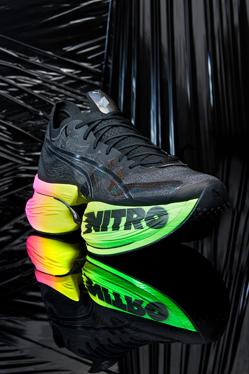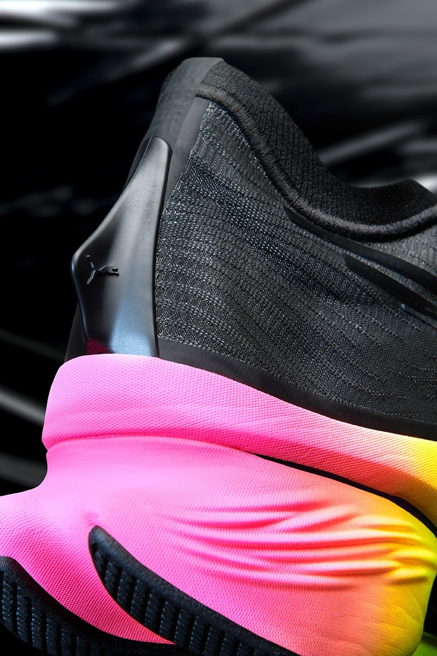 中底材质采用 PUMA 当家的 NITRO 科技,并且是色彩鲜艳的渐变设计,既保证了脚感,又有夺目的视觉效果。