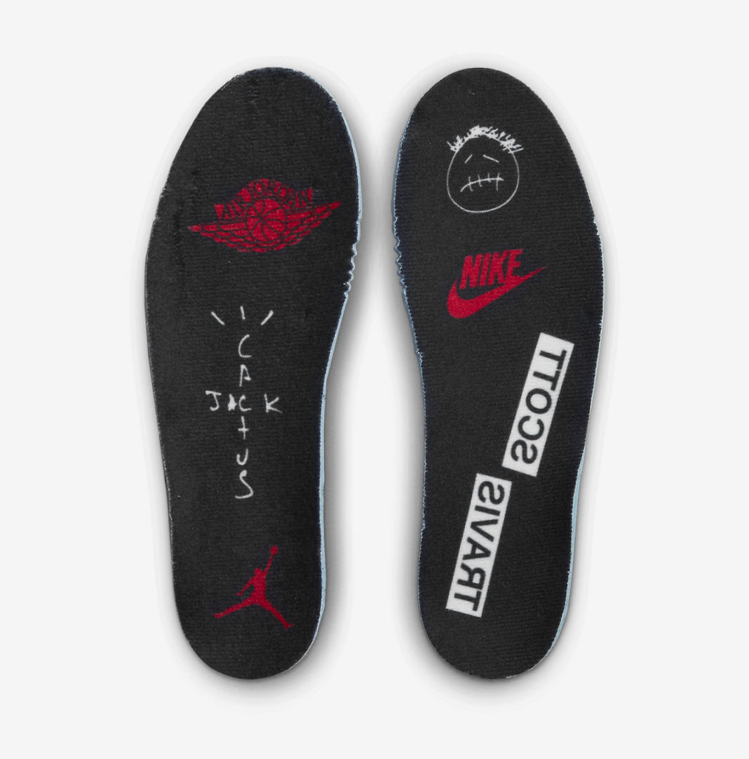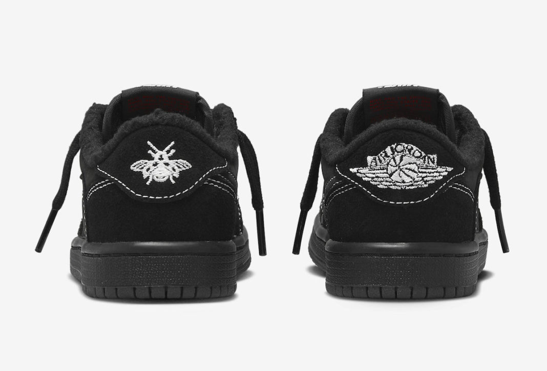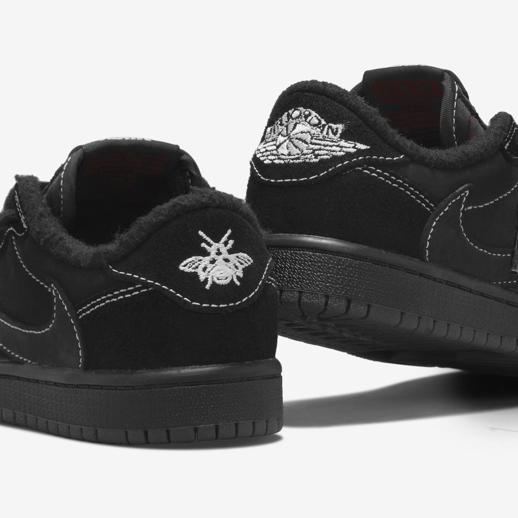 右脚后跟是经典的飞翼 Logo,左脚改为象征 Travis Scott 女儿 Stormi 的蜜蜂刺绣。