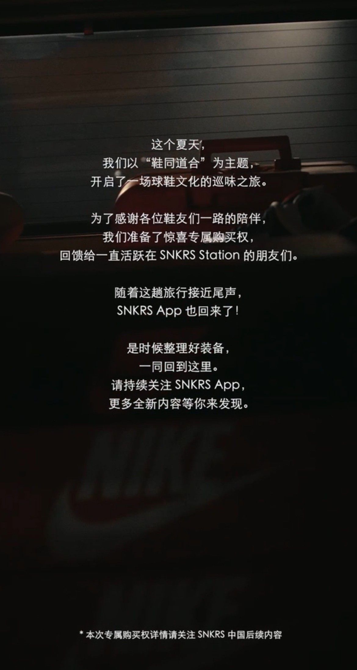 短片结尾,Nike 正式揭露了回馈玩家的消息: 为一直活跃在 SNKRS Station 的朋友准备惊喜专属购买权。