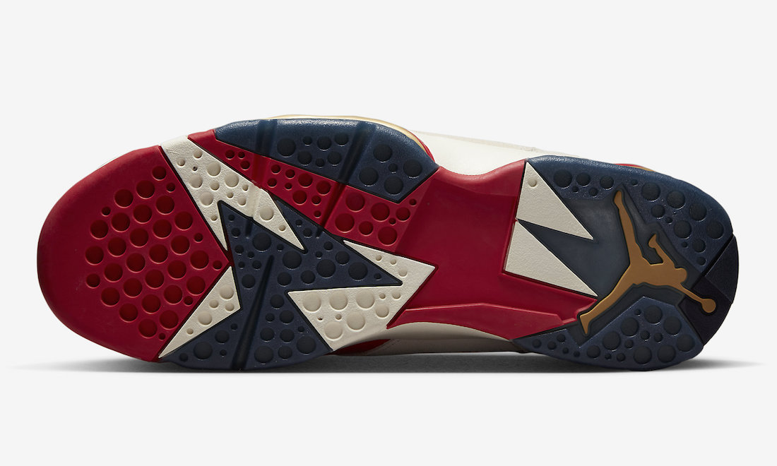鞋面采用梦之队经典的红、蓝、白三色构建,细节辅以翻毛皮革、金色金属及象征奥运五环的彩色线条点缀,大底则延续元年「奥运 Air Jordan 7」的蓝红金设定,致敬意味浓厚。