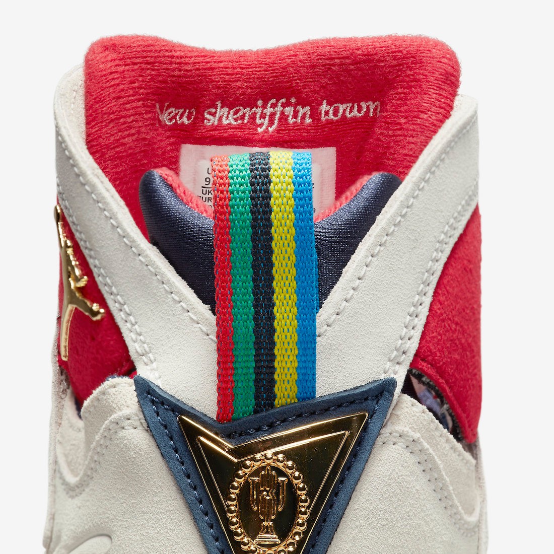 鞋舌内侧刺绣 “New sheriff in town”,出自梦一队训练中,魔术师对乔丹的评价。