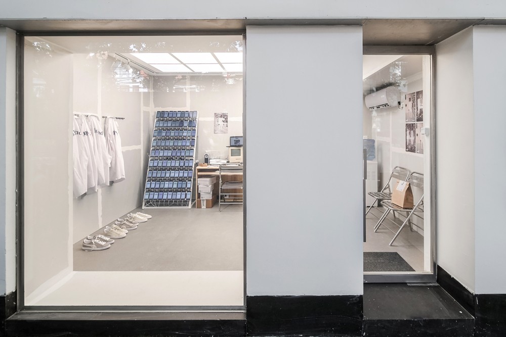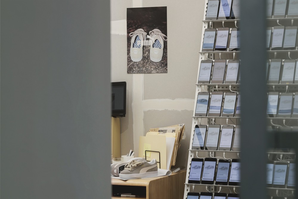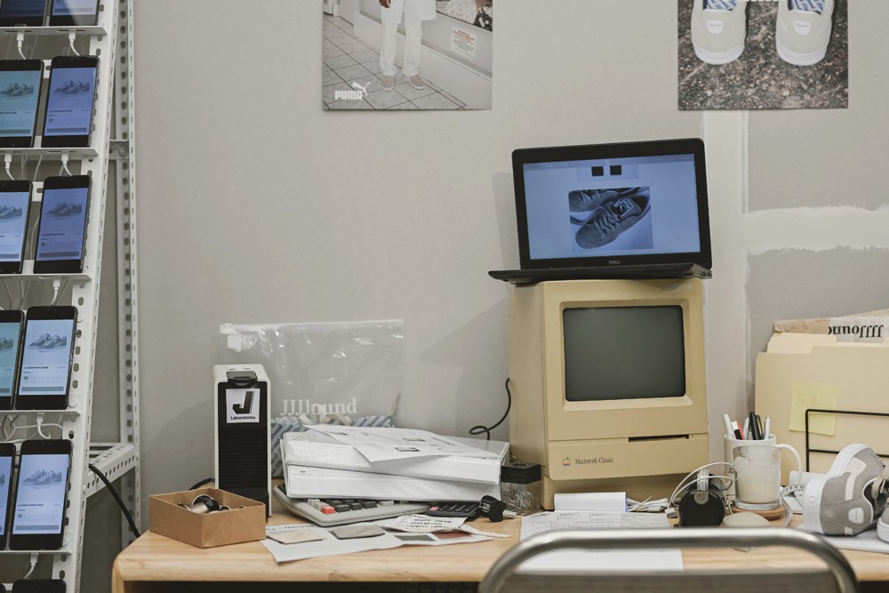 在犹如「黑客实验室」般的灰白色调概念空间中,摆设了智能手机墙、实验袍、复古台式电脑等一系列道具,将 PUMA x JJJJound 联名鞋款自然地融入场景。