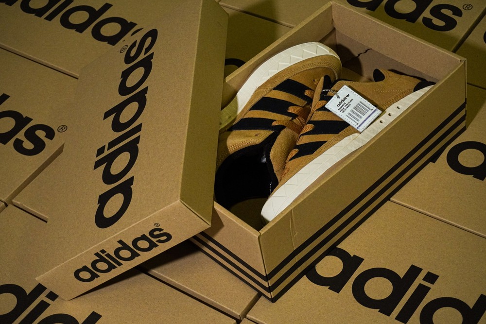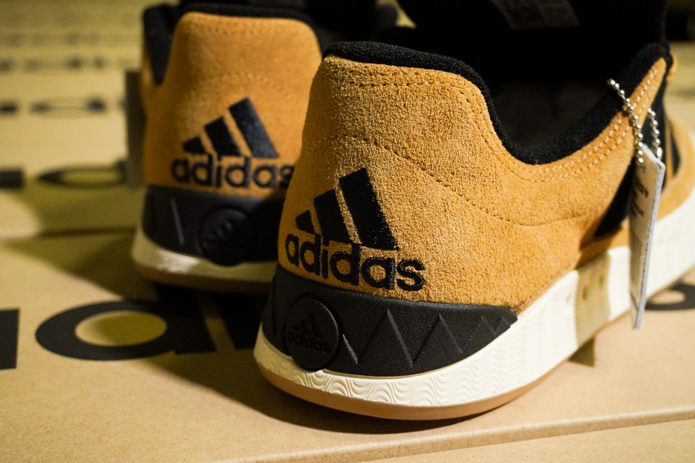 这个鞋型迎来与 atmos 的第二次合作,此次配色灵感来源于 1996 年发布的 Adimatic OG 鞋盒,以棕色为主调,鞋侧呈现黑色三道杠 Logo。