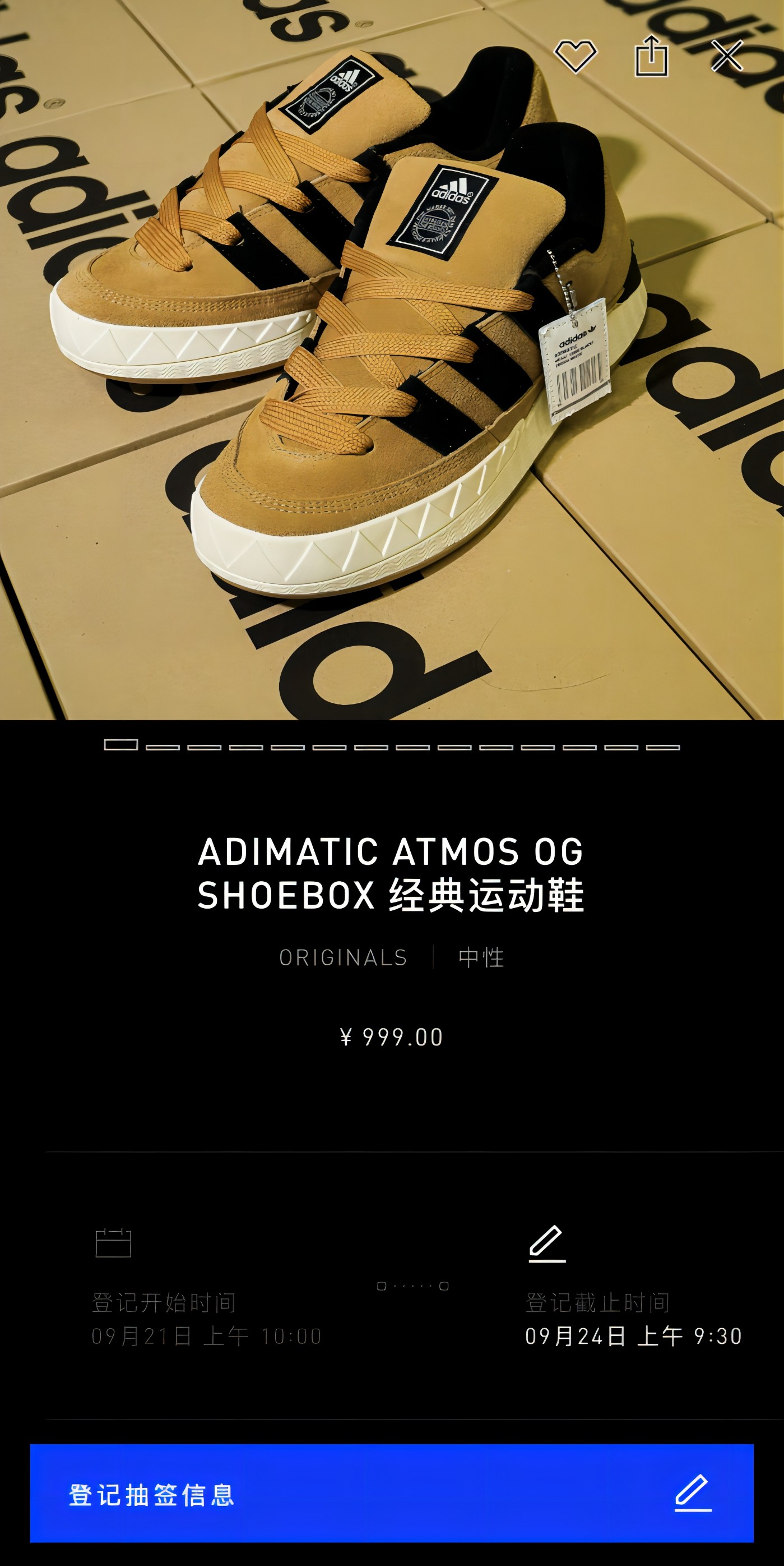 目前,全新 adidas Originals ADIMATIC atmos OG SHOEBOX 已经在 CONFIRMED APP 开启抽签,登记截止到 9 月 24 日 9 点 30 分,发售价格为¥999 元,感兴趣的小伙伴一定要抓紧时间登记。