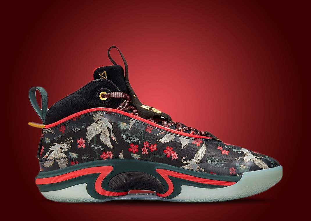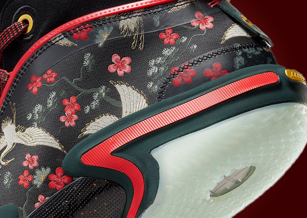 最大亮点在于黑色鞋身辅以仙鹤与花卉点缀,材质方面也一改常规的网眼结构,采用织物衬托。