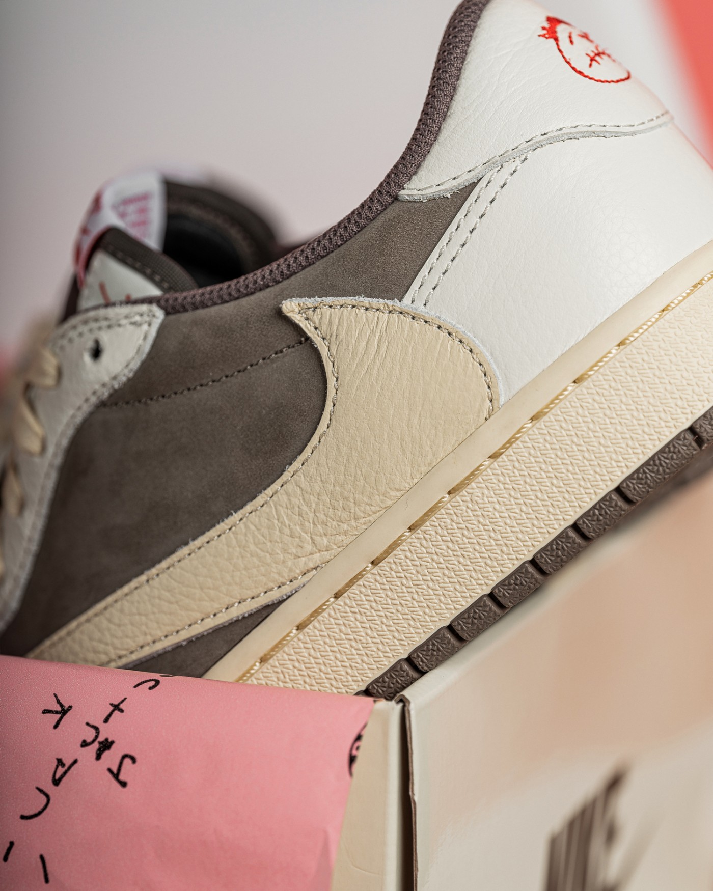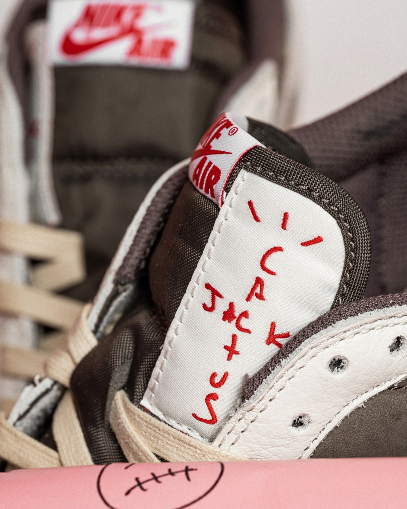 衬纸辅以粉红色衬托飞翼、复古 Nike Air 标志、TS 厂牌 Cactus Jack 以及标志性的卡通鬼脸 Logo,彰显联名的独特身份。