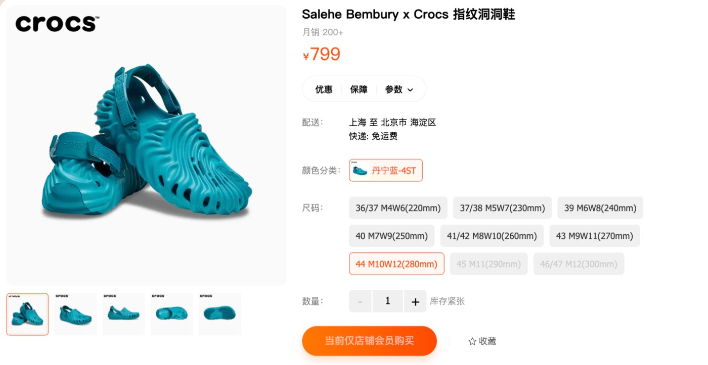 现已在 Crocs 天猫上架,这次无需登记抽签,只需免费开通店铺会员即可参与购买。