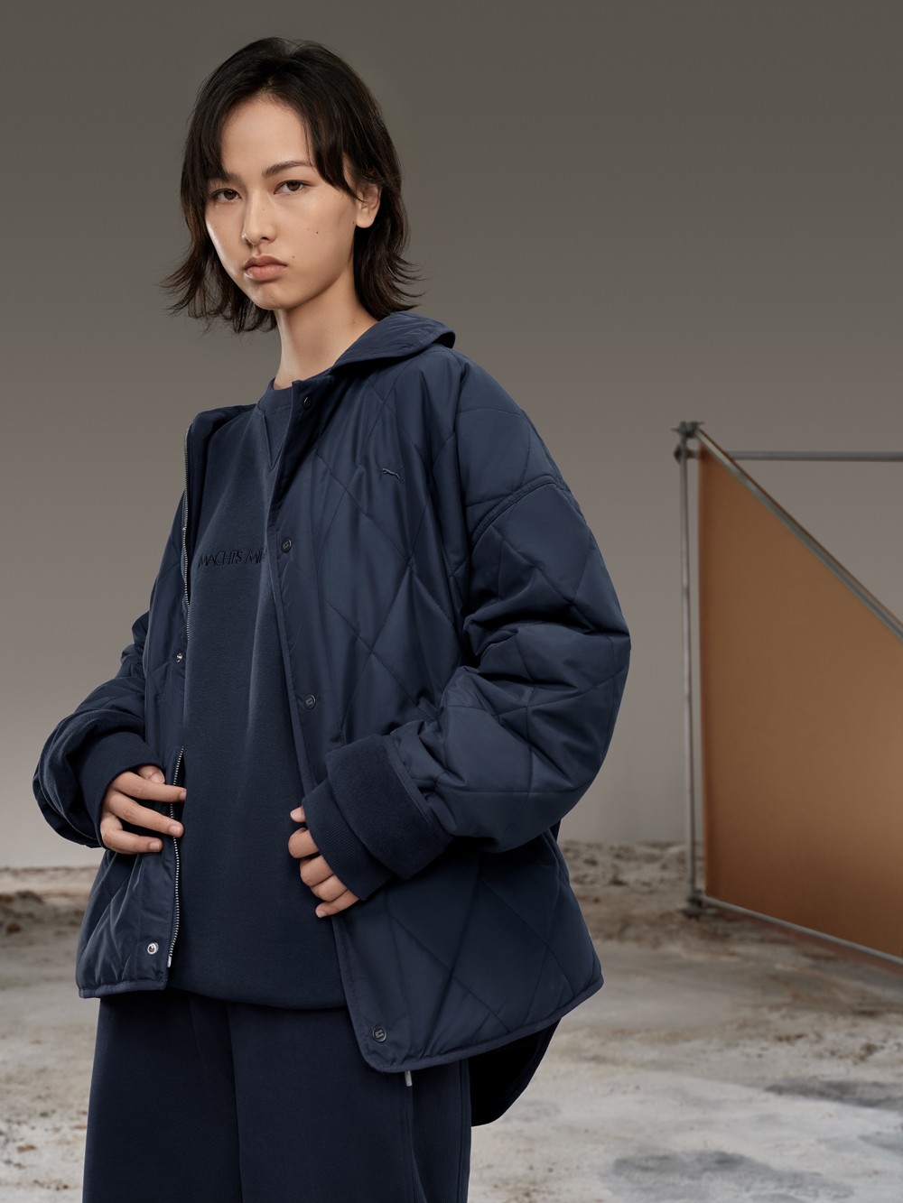 一面是菱格绗缝纹路,另一面是同色系柔软亲肤的桃皮绒材质,将机能感与高级感融为一体。