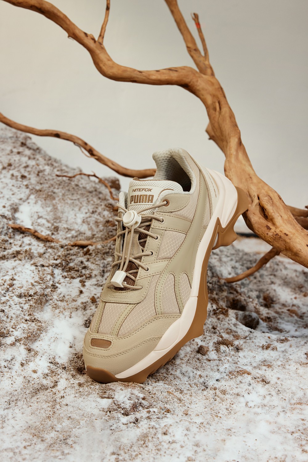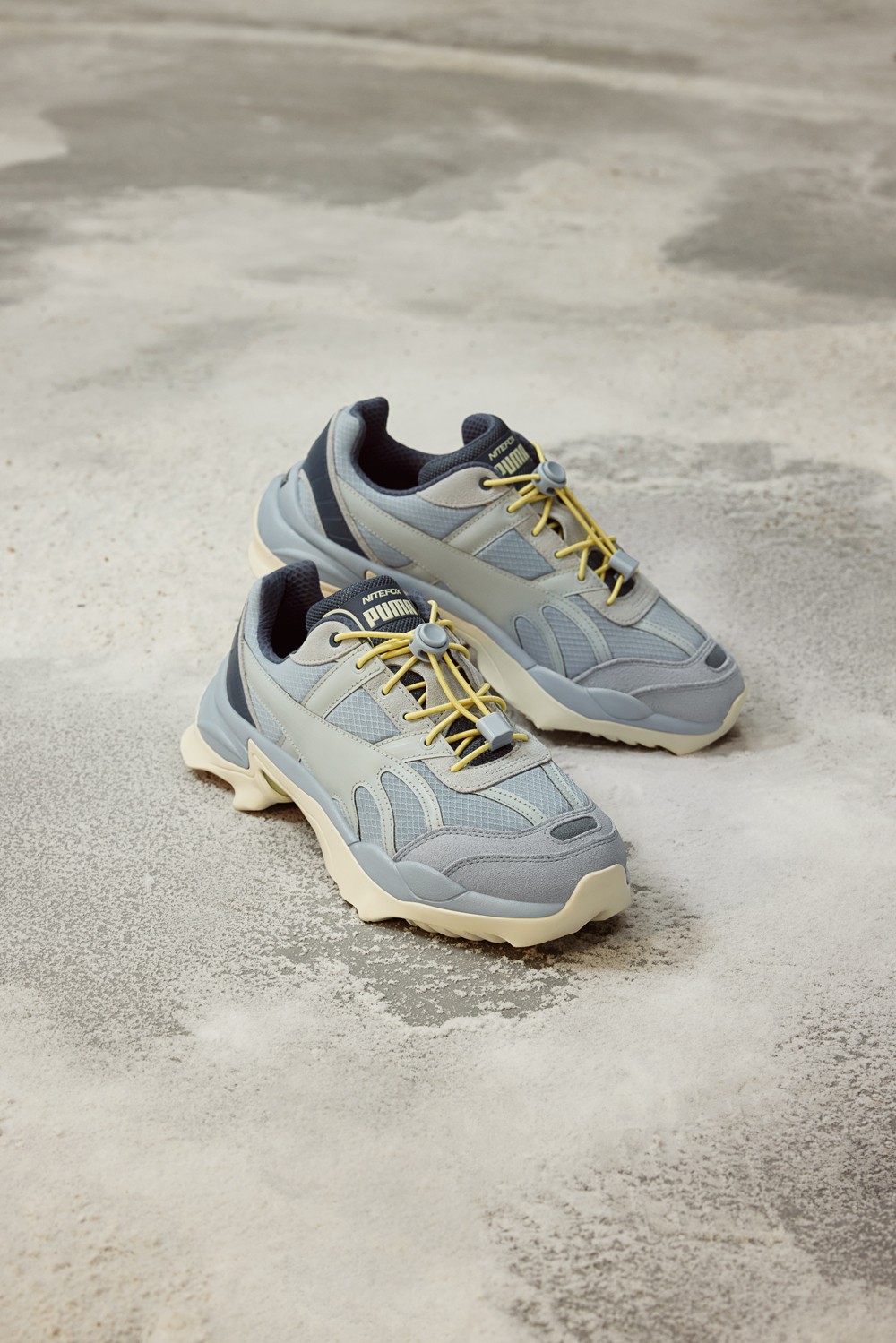 鞋款方面,以 PUMA Nitefox 为蓝本,带来大地色系三款新配色,以棕黄、哑灰、浅蓝的低饱和度为主调,配色方案十分贴合秋冬气氛。