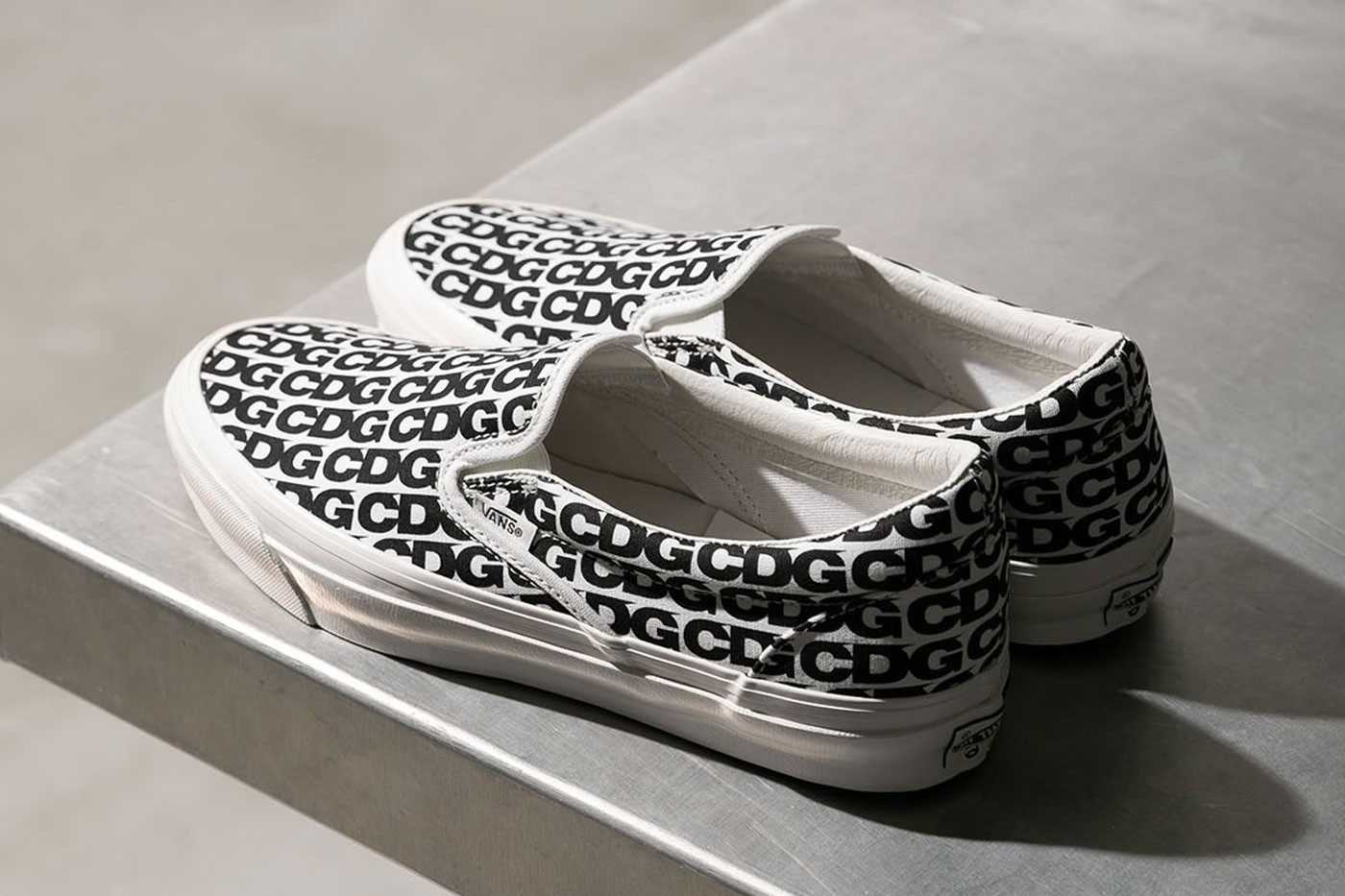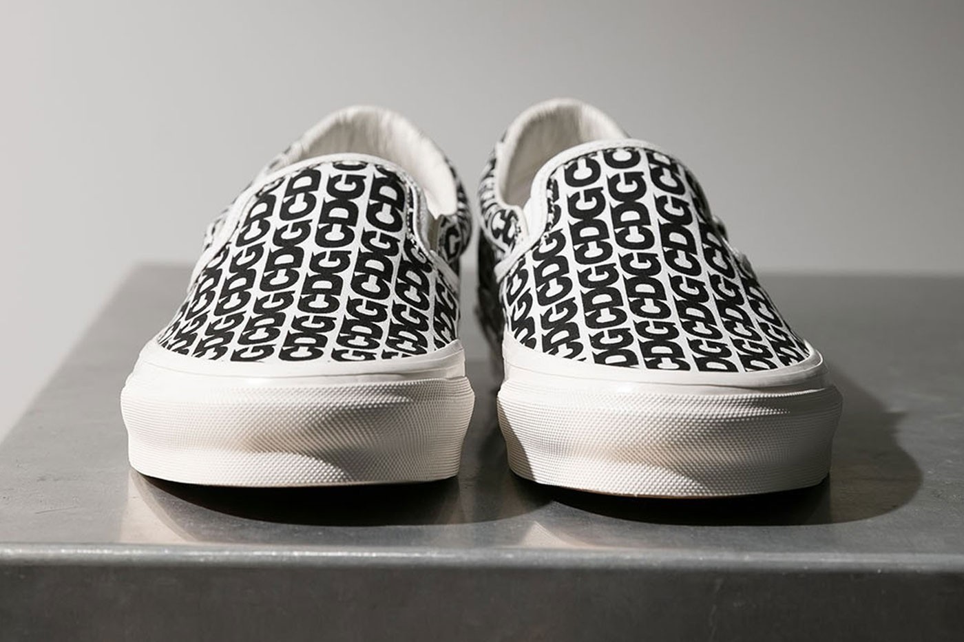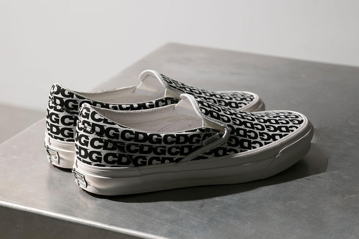 配色方面以 CDG 最擅长的黑白撞色呈现,营造出 Vans 最经典的黑白棋盘格装扮。