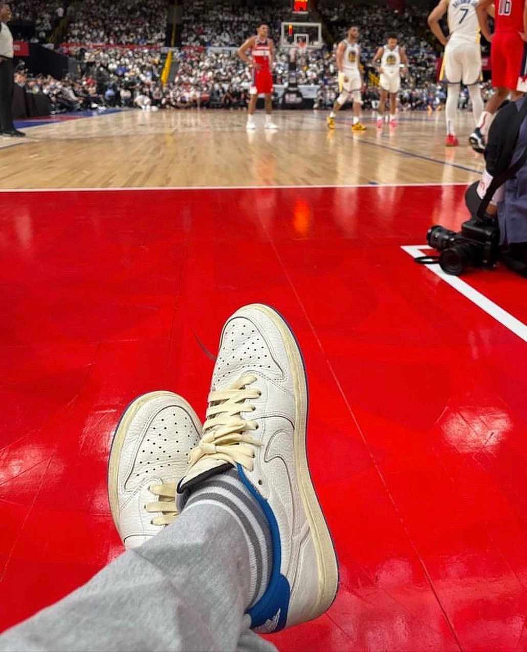 他在出席 NBA 日本赛的当天,选用了这双白蓝配色的低帮倒钩。