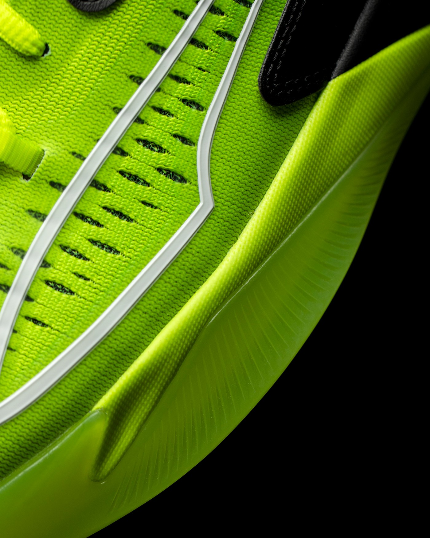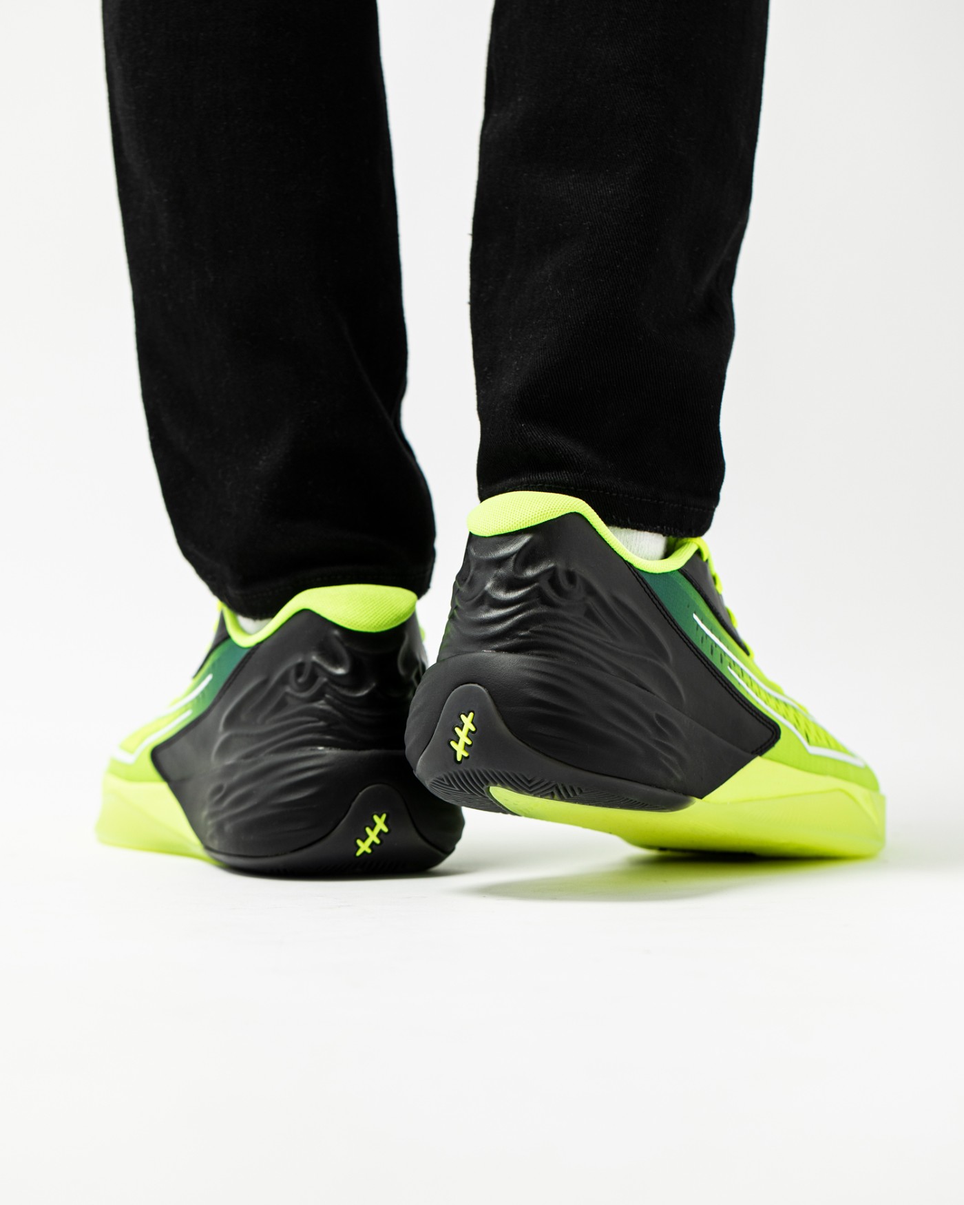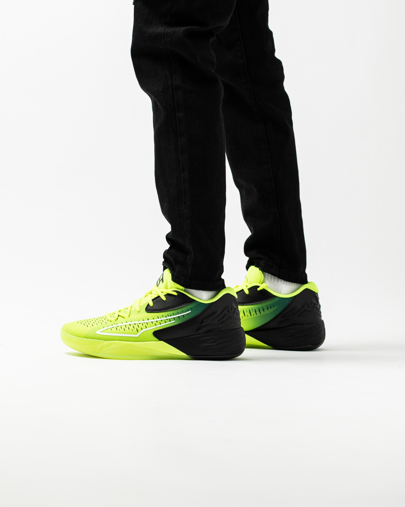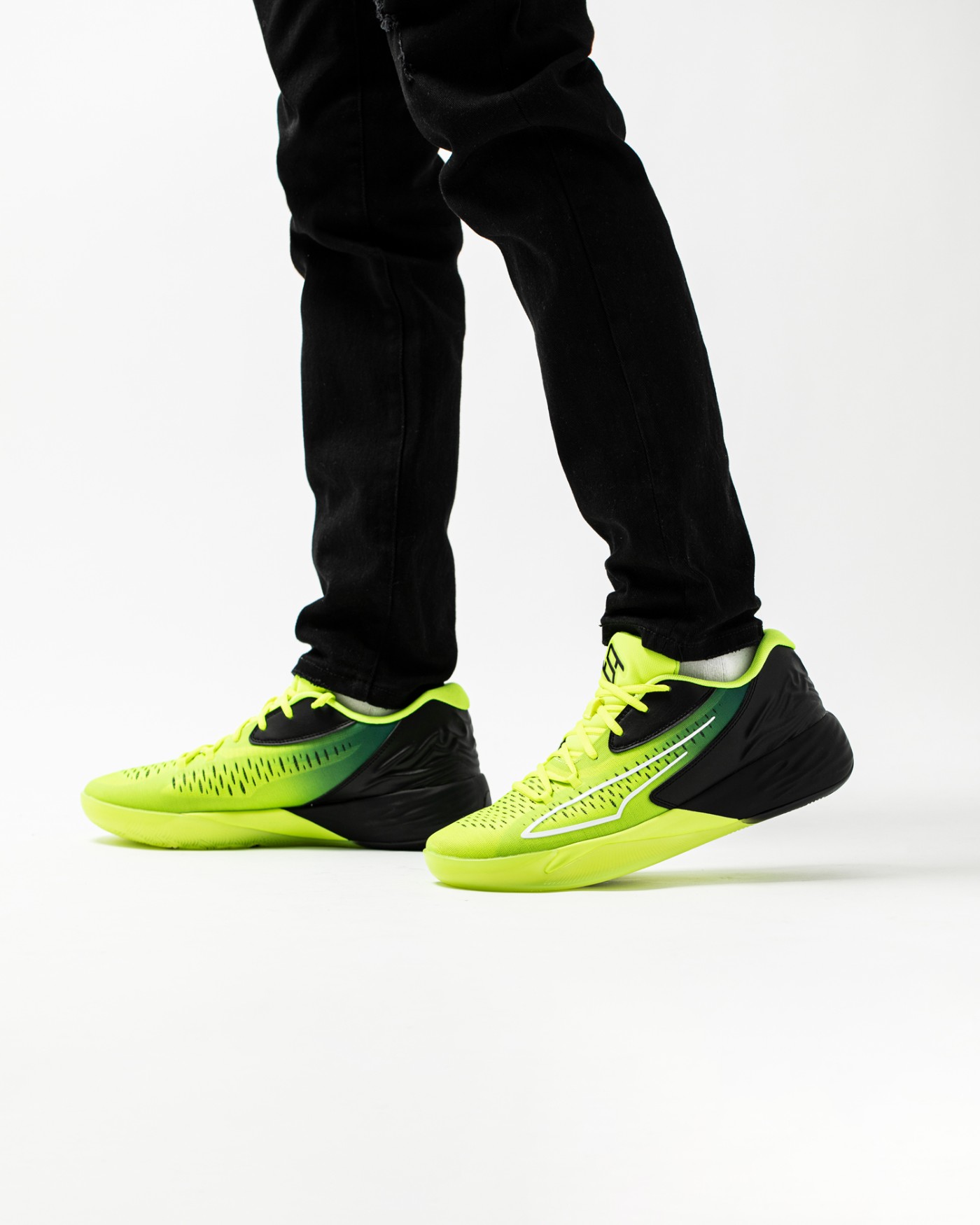 上脚效果还是相当帅气的,低帮设计搭配贯穿鞋面鞋底的荧光黄 + 黑色撞色设计,速度感十足。