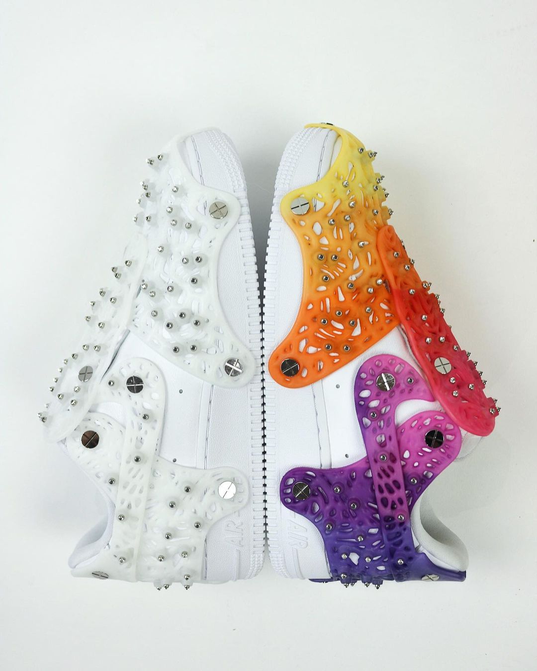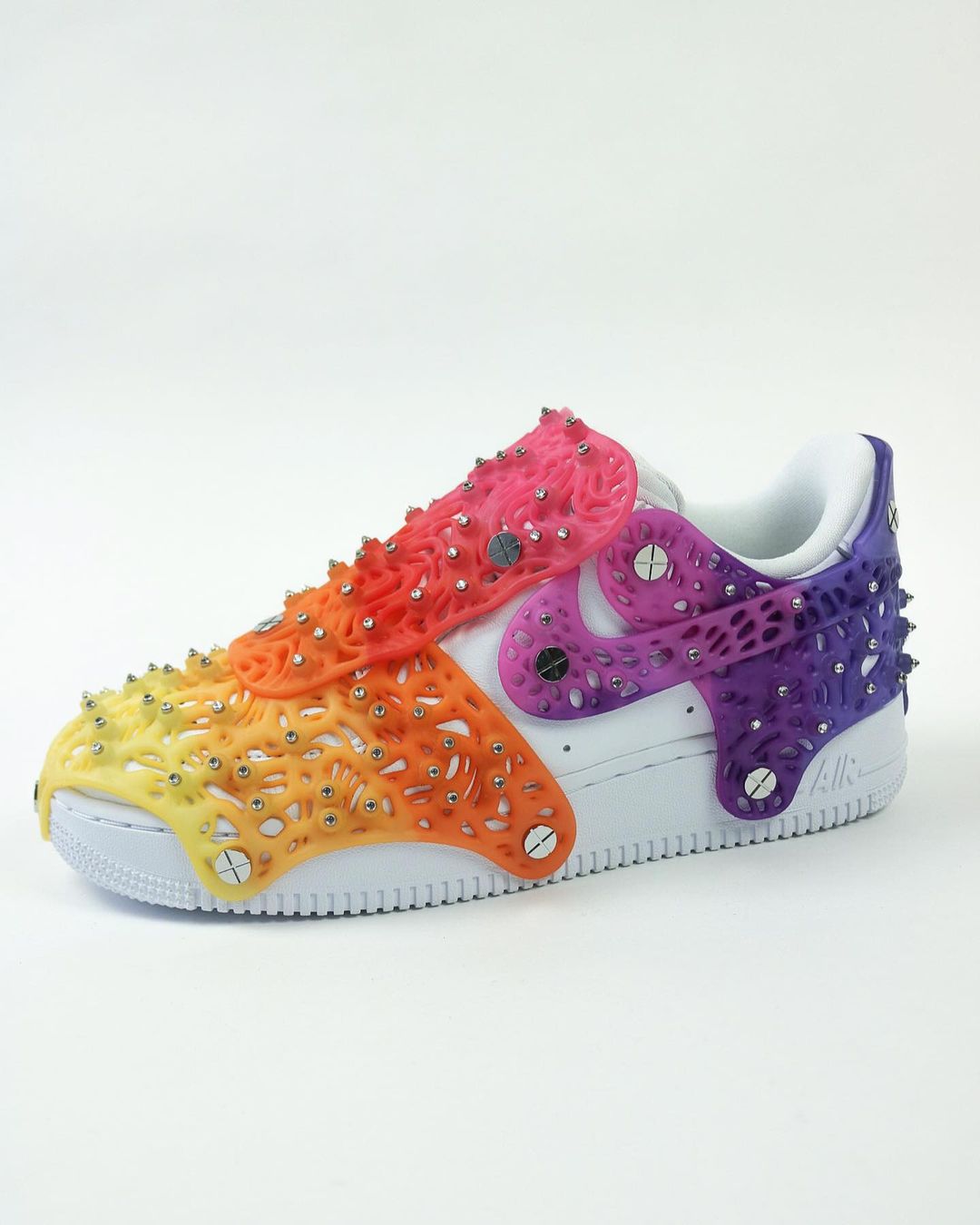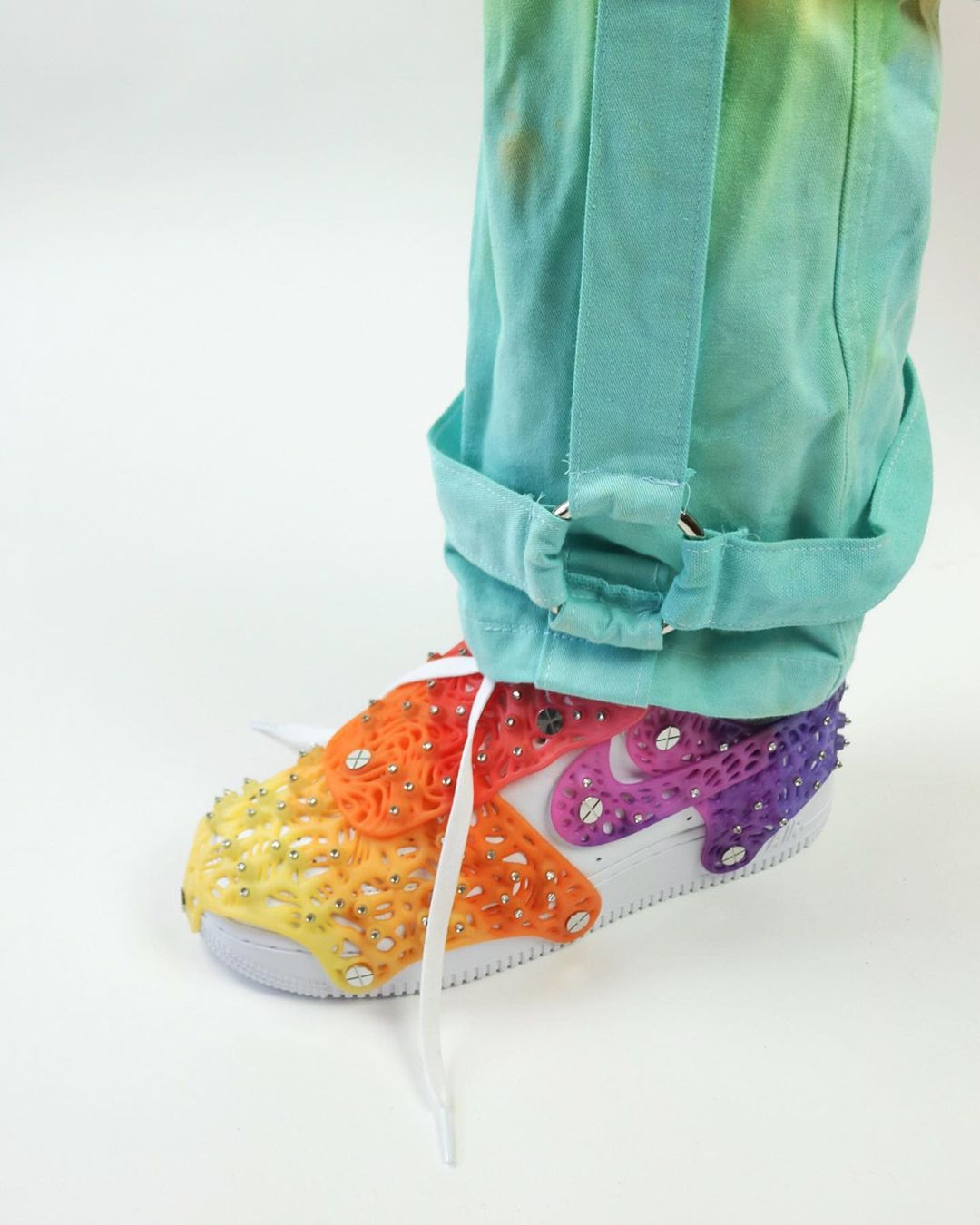 而这双定制鞋保留了鞋面经典的白色装扮,只把网状结构的外壳染成了彩虹色,小编觉得这双鞋改造的还是相当成功了。