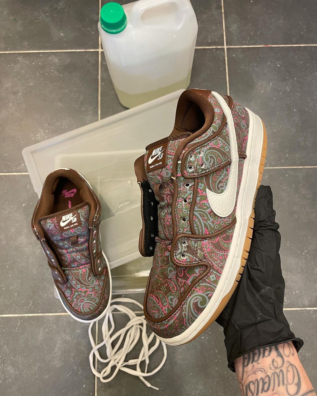 设计师给为其命名为 Paisley Sunset(腰果花日落),这双鞋的原型是目前市价 ¥1300 元的 Nike SB Dunk Low “Paisley”。