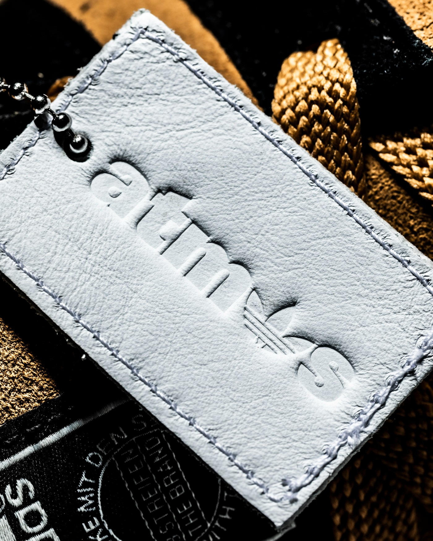 首先最明显的就是随鞋附赠了一个吊牌,整体材质为柔软的皮革,正面印有融入三叶草的 atmos 字样。