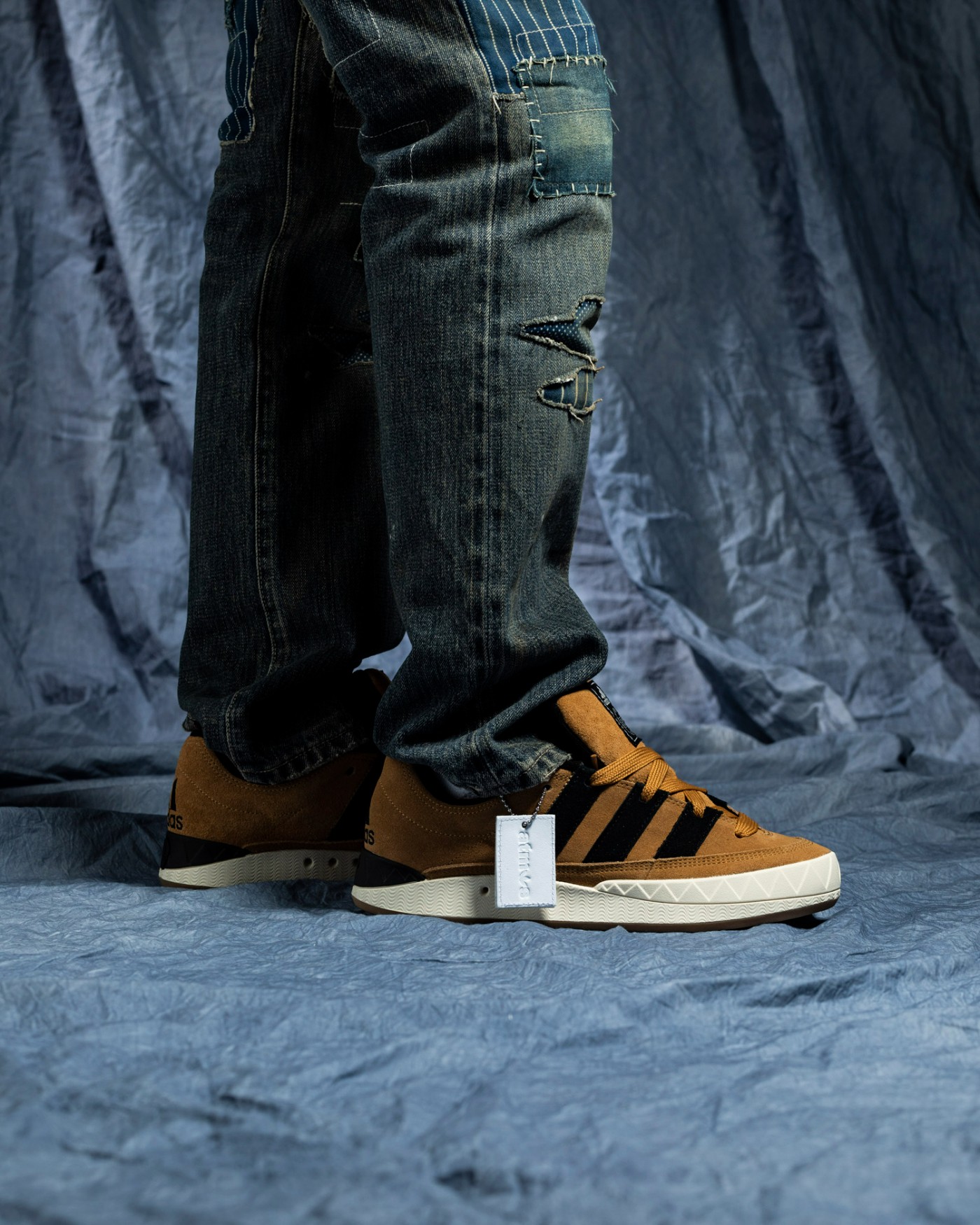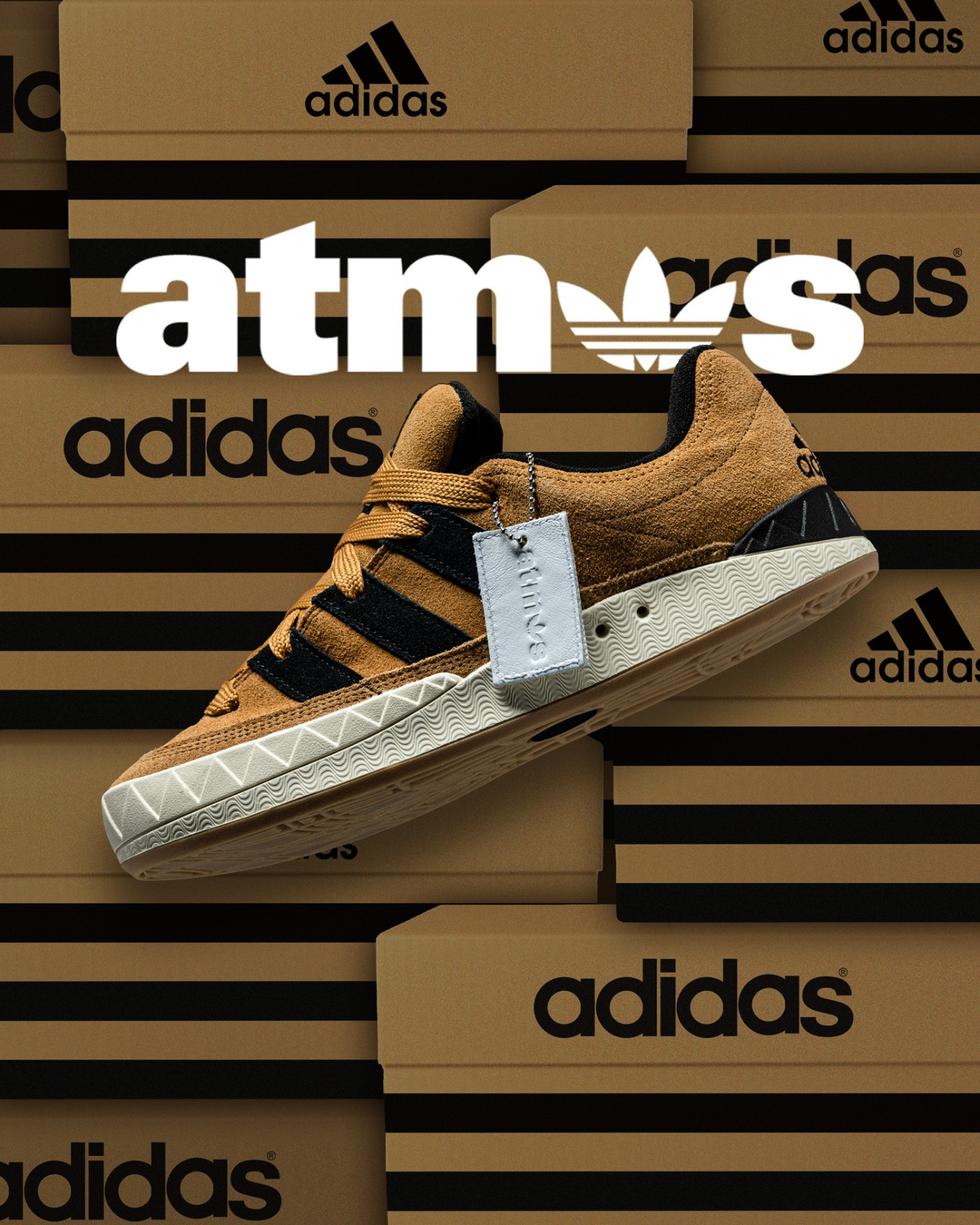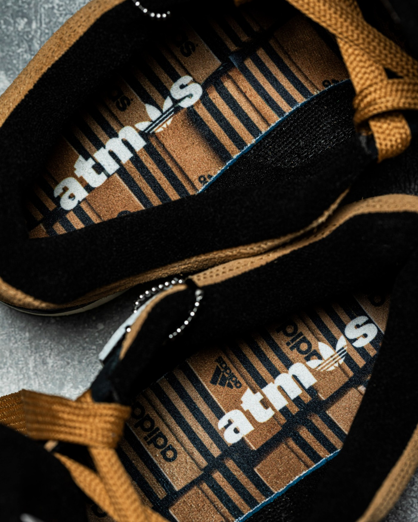 最大的亮点在于鞋垫,不光印着和吊牌上相同的 atmos 字样,还追加了大面积 adidas 复古老盒图案,彰显此次配色的独特身份。