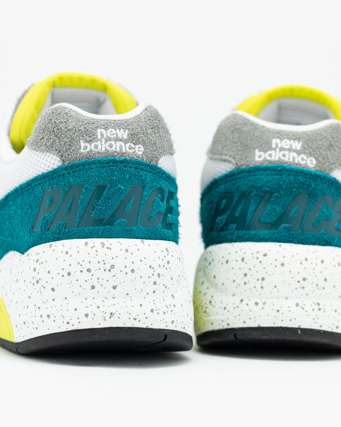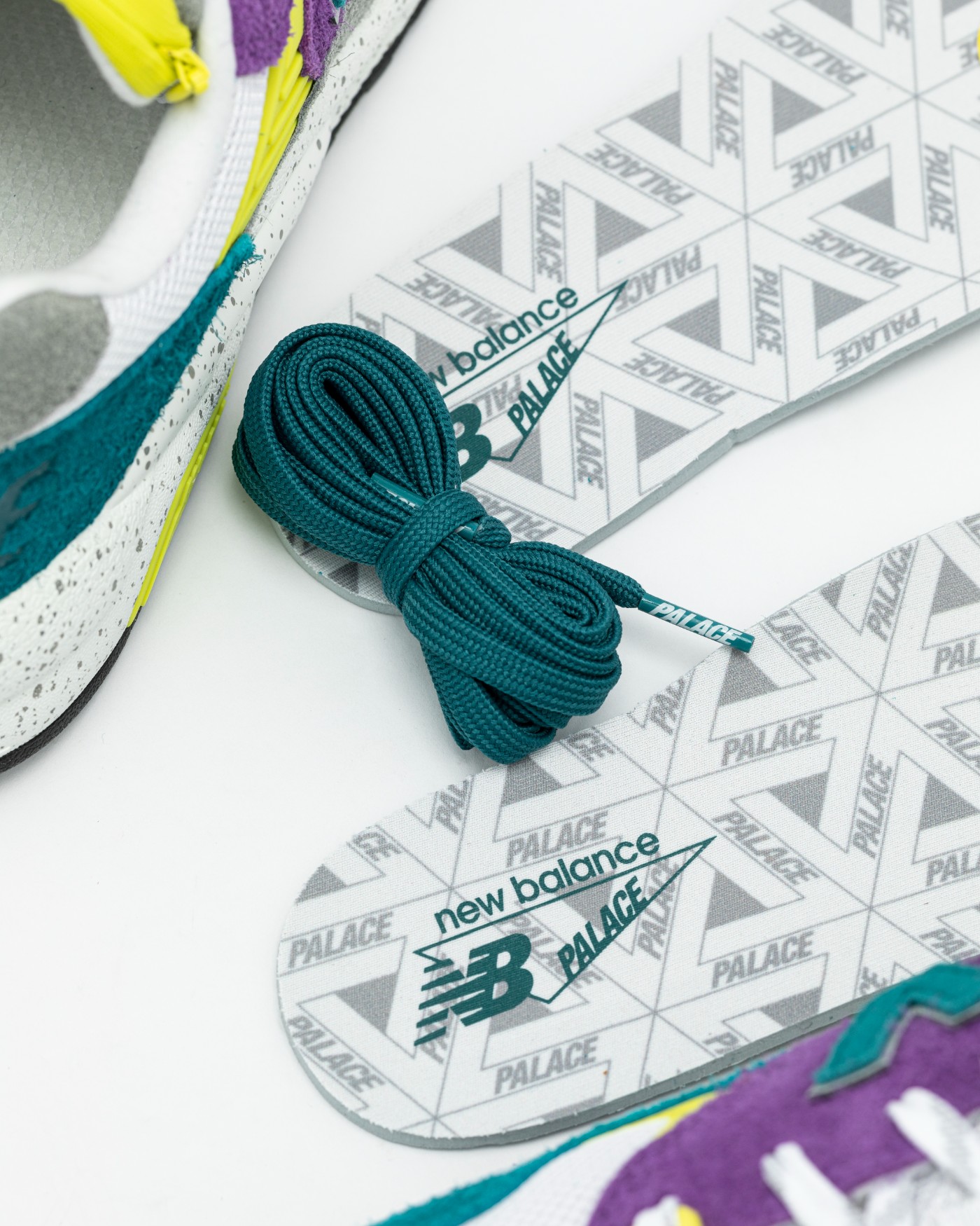 鞋舌外侧、鞋后跟和鞋垫处印有 New Balance 和 Palace Logo,彰显本次联名身份。