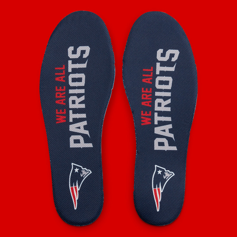 整双鞋采用通体海军蓝色呈现,辅以灰色红色细节,营造出爱国者队 Logo 的视觉效果。