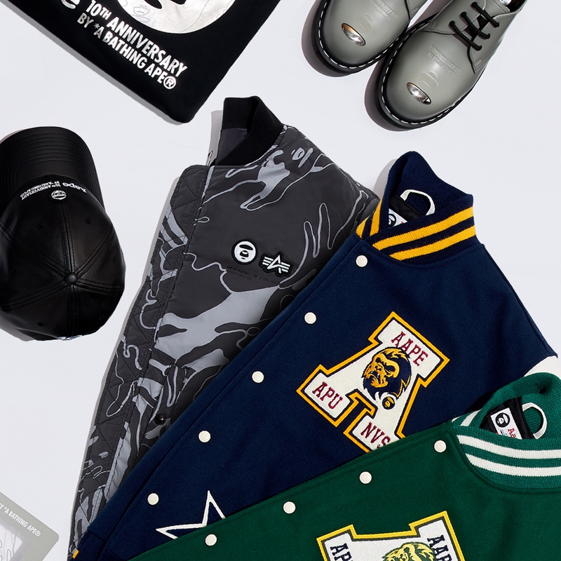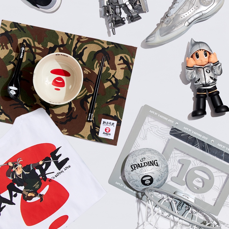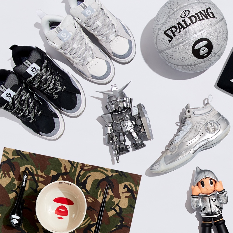 除了服饰外,此次 AAPE 十周年还携手 SPALDING、 LINING 、 DR. MARTENS、GOLDEN BEAR、ASTRO BOY、GUNDAM、ALPHA INDUSTRIES、 NEW ERA、 MENYA MUSASHI 推出了众多联名单品!