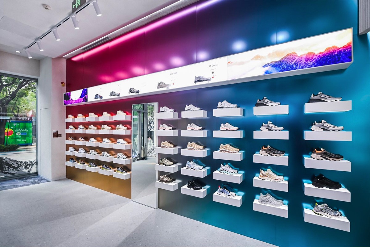 店面装潢围绕「山」、「雪」 为主要元素开展,门店中央设置高低起伏的圆环装置,让 Salomon 各品类装备得到最直观的展示, 搭配模拟雪地肌理的鞋墙纹路,让消费者当即进入户外活动氛围当中。