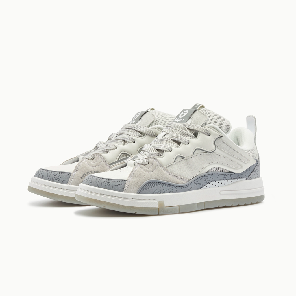 后跟皮料镭射迷彩纹路结合气泡型 AAPE MOONFACE 猿颜 Logo,以玩味十足的精致细节彰显联名身份。