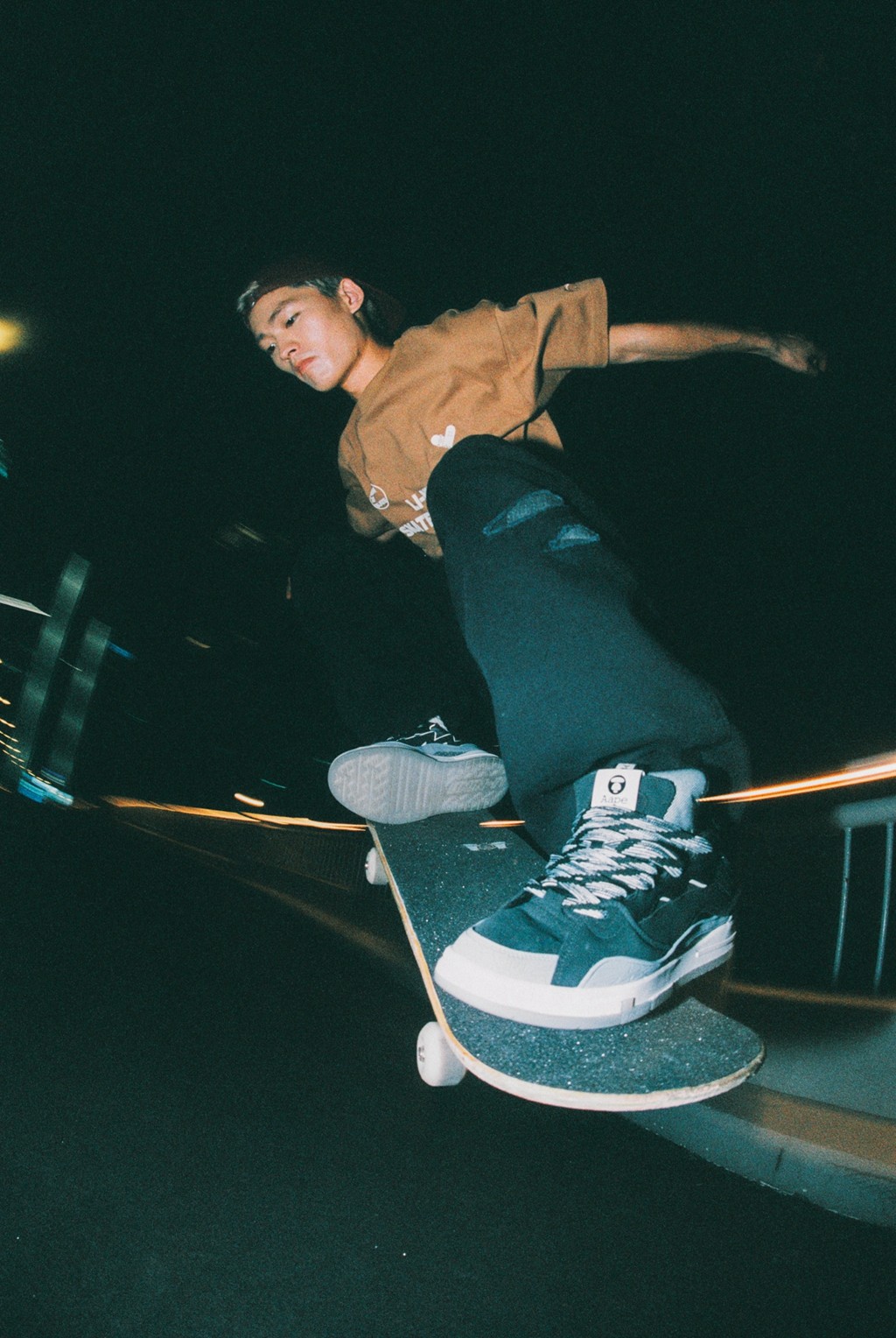 标志性的肥大鞋舌和加宽鞋带是主要特征,配合显眼的 AAPE Logo 织唛,释放独特的街头属性。