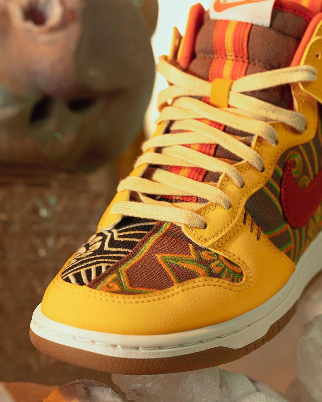 先看 Dunk High,鞋面框架采用大面积的南瓜色覆盖,其余部分则填充墨西哥传统图腾。