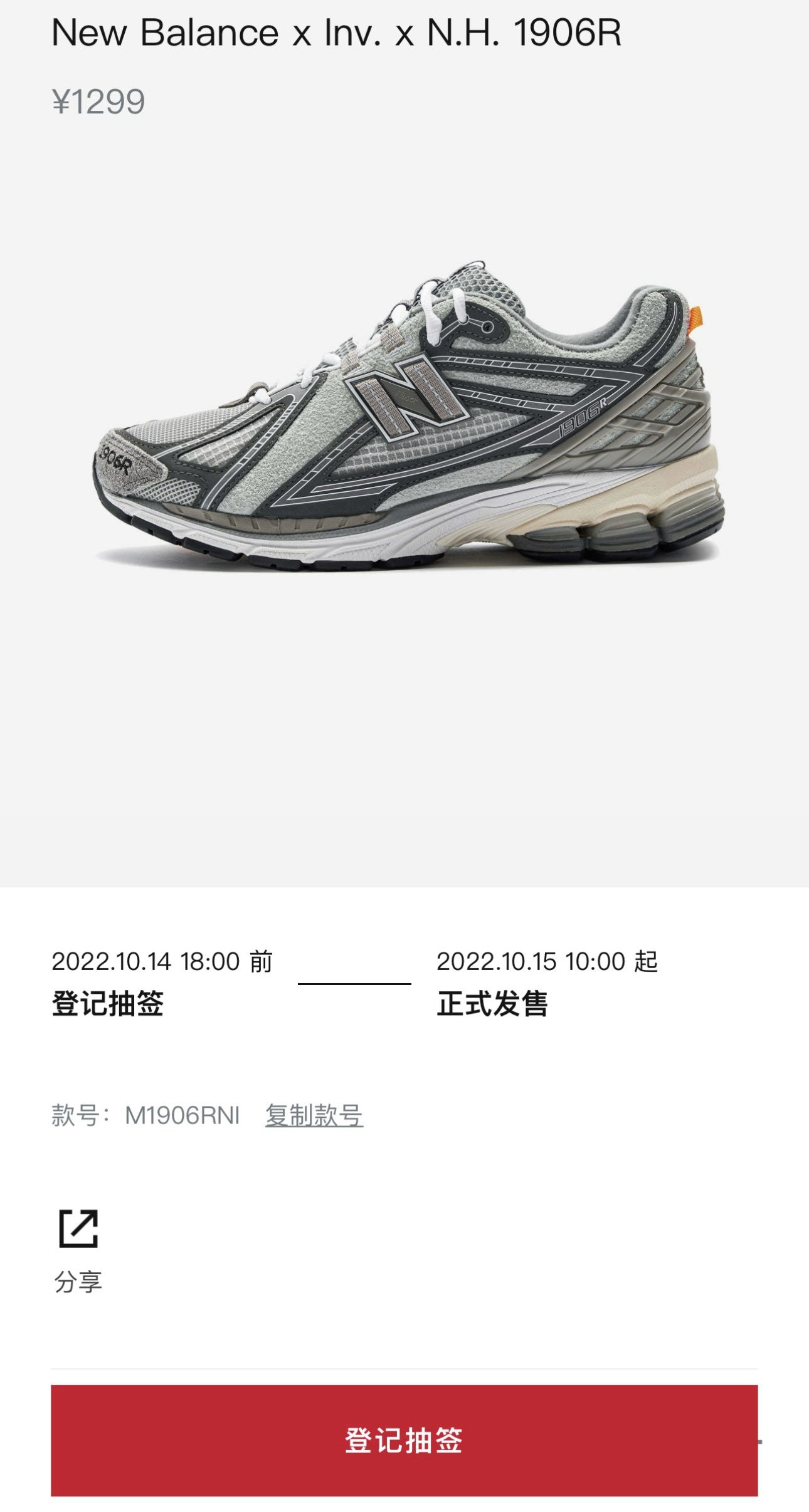 目前,这双 INVINCIBLE × N.HOOLYWOOD × New Balance 1906R 现已在 New Balance 小程序开启登记,登记截止至明天 18:00 前,售价为 ¥1299 元,感兴趣的小伙伴不妨抓紧时间行动吧!